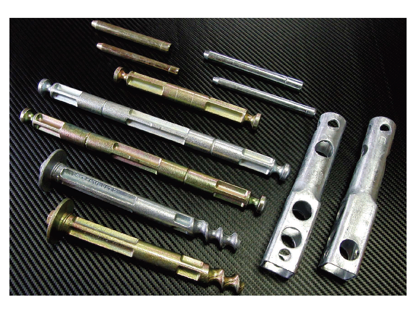 APS工法の要ともいえる「アップルピン」。これらの主素材には、ダクタイル鋳鉄+鋼を使用し、フレームの長寿命化に配慮しています。ダクタイル鋳鉄は、マンホールに使用されるなど非常に高耐久で高品質な物質となります。