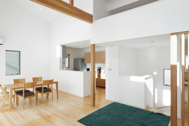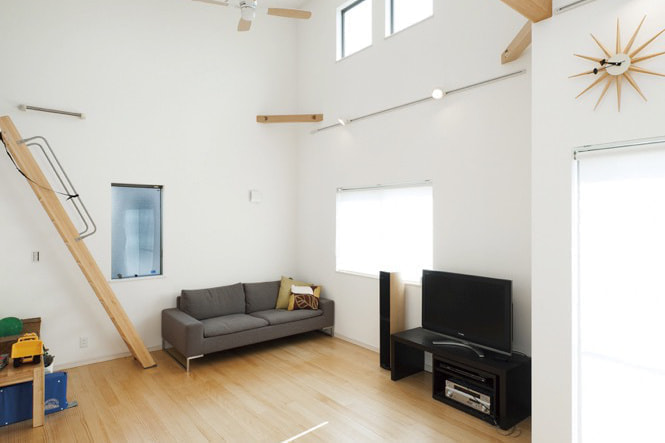 大きな吹き抜けになっている2階リビングは、風の通りを考えてパッシブな窓配置になっています。