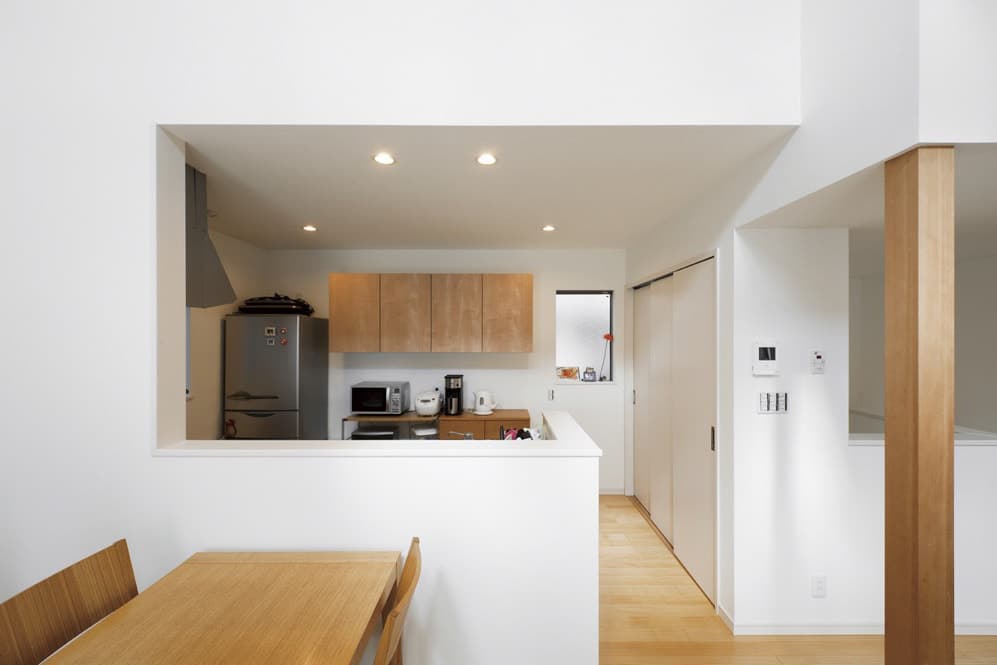 作業スペースの見えない立ち上がりのある対面式キッチンは、キッチンの上が汚れていても目隠しになるのでオススメです。
