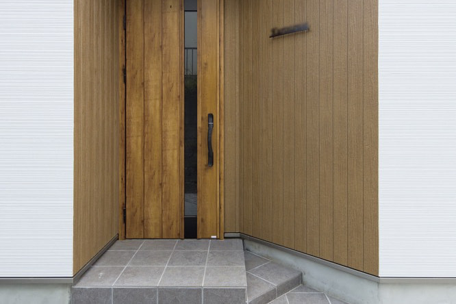 家族を出迎える玄関部分は、アプローチの階段段数や配色、玄関の質感など非常にこだわったポイント