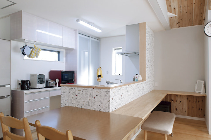 キッチン周りには、家族が自然と集まるカウンターを造作で設置。