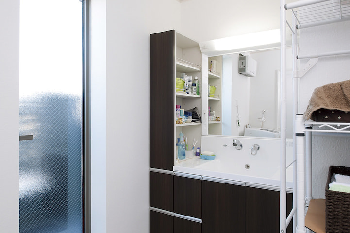 広々開放的な洗面スペース。洗った洗濯物をすぐに干せるように、勝手口からバルコニーへアクセスできる。