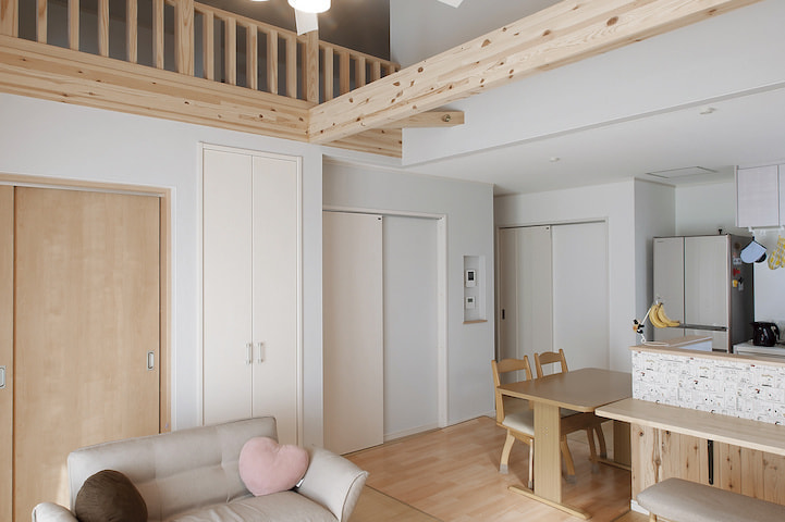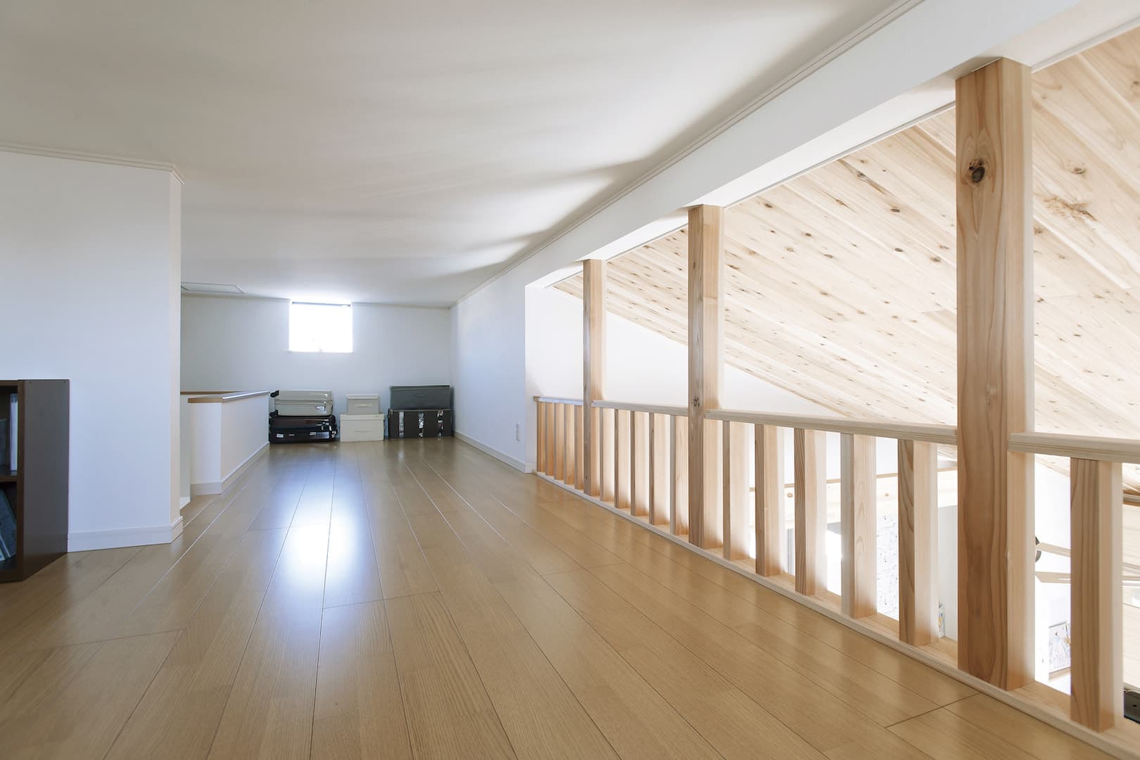 ロフトとリビング空間は、無垢材で出来た柵によって開放的に仕上げているので、空気がこもる事なく夏場も快適な空間になっている。