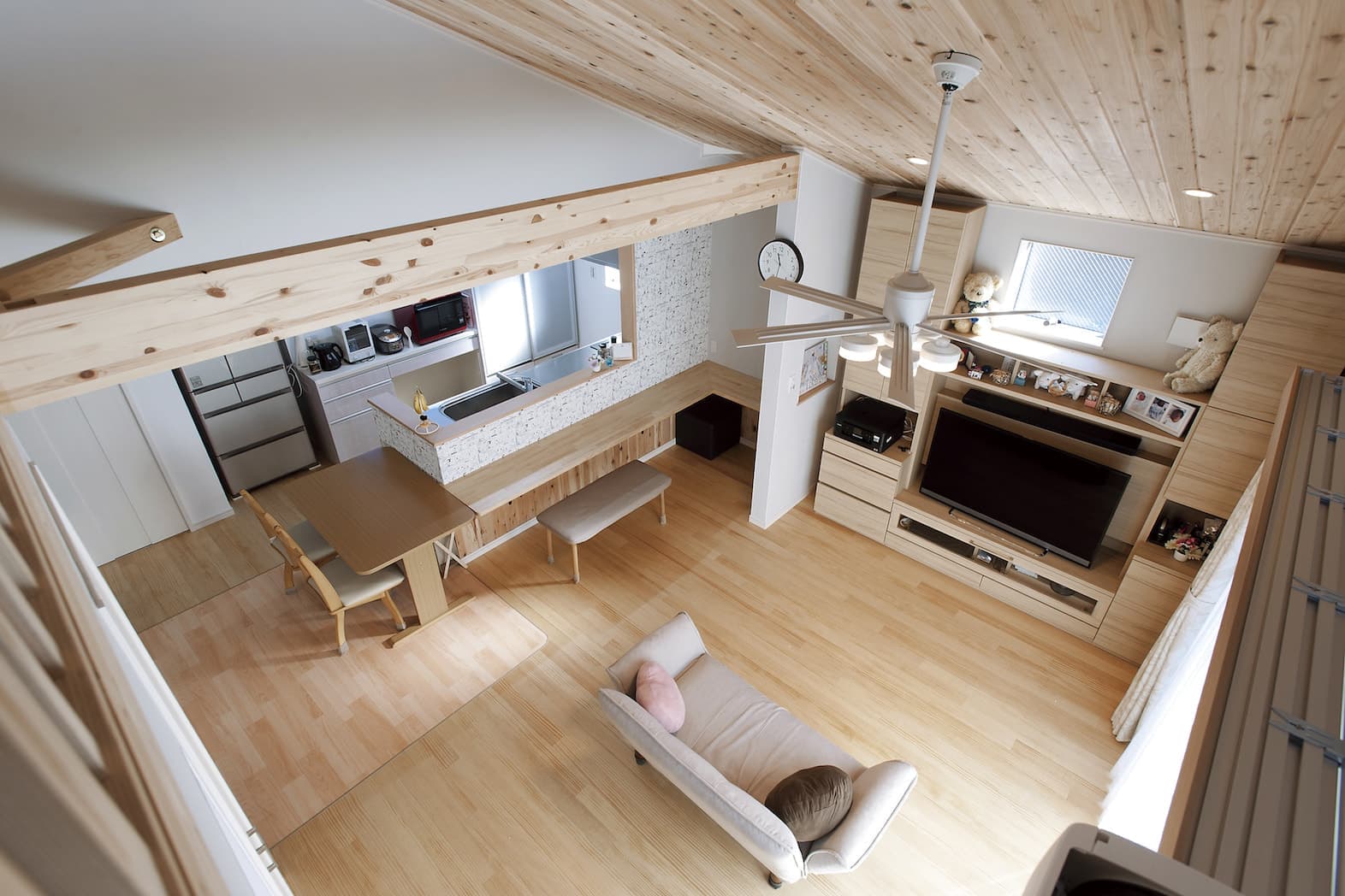 高い勾配天井に自然の表情がある構造材、面積以上に広々快適に感じる事が出来ます。