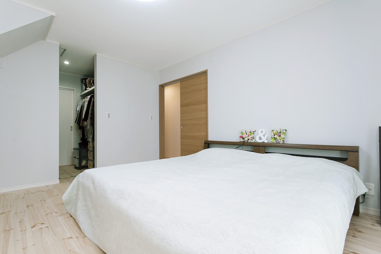 主寝室へのアクセスが、玄関からウィークインクロークを通るルートでも可能なので、すごく疲れて帰宅してもスーツをかけてそのままベッドに横になれる。寝室入り口には、手洗い場も用意してある。