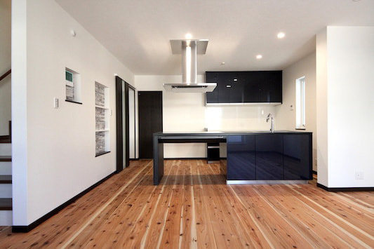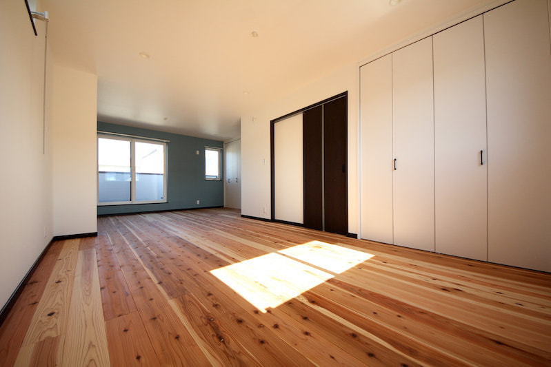 広々快適なリビングルームには、無垢の床をチョイス。自然素材を使用したコーティング剤を使用して、艶のある上品な床になっています。
