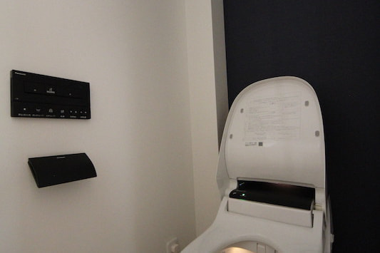 トイレ背面には、暗いカラーの壁紙をチョイス。落ち着きのあるシックな空間となりました。