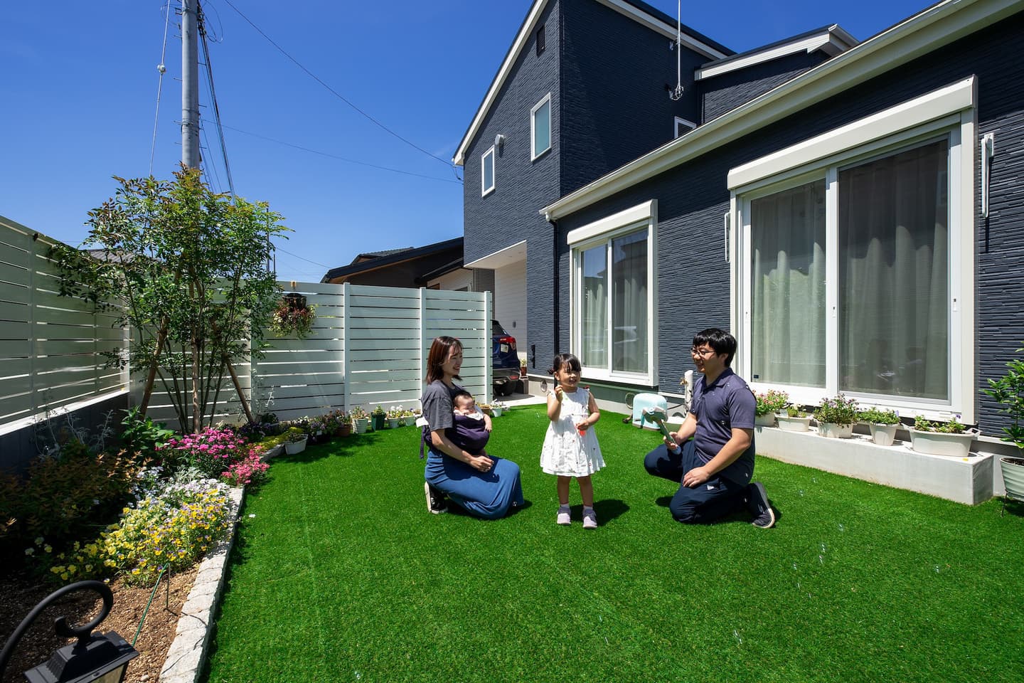 植物好きと話すご夫妻がお手入れした広く美しい庭で楽しむSさんご家族。「プールで水遊びを楽しむなど、庭で子どもをのびのびと遊ばせることができるのもいいですね」とSさん。窓枠などに使った白と、白いウッドフェンスが調和した上品な家が完成