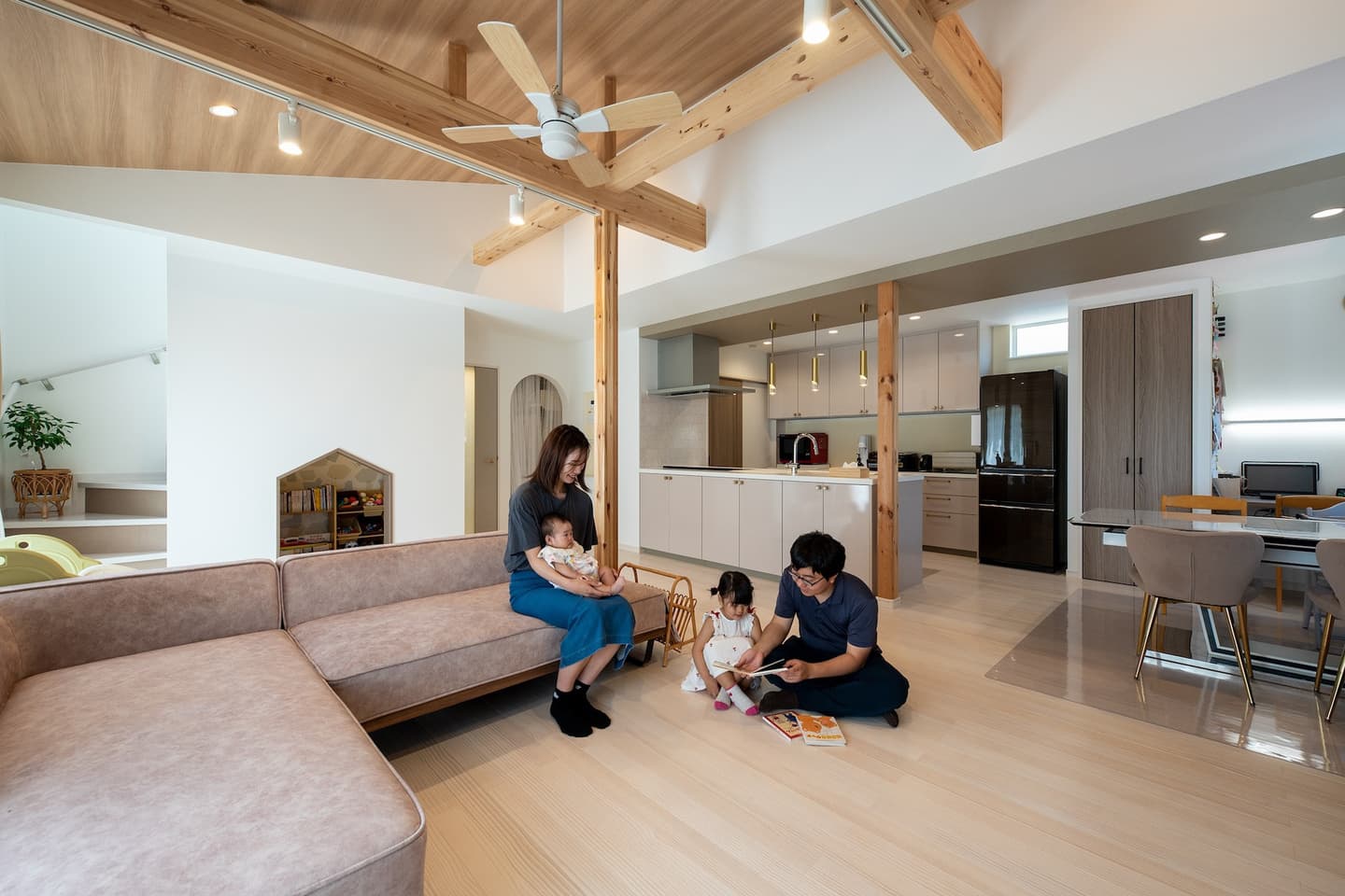 ソファの後ろはお子さんの遊び場として活用。キッチンで料理をつくりながらでも目が届くのでママも安心だ。「勾配天井はご提案いただいたものなのですが、とてもいいですね」とSさん。「音などを気にせずに子どもをのびのびと遊ばせられます。ピアノの音を気にすることなく弾かせることができるのも嬉しいですね」と、夫人も断熱性能、防音性能の高さを評価する