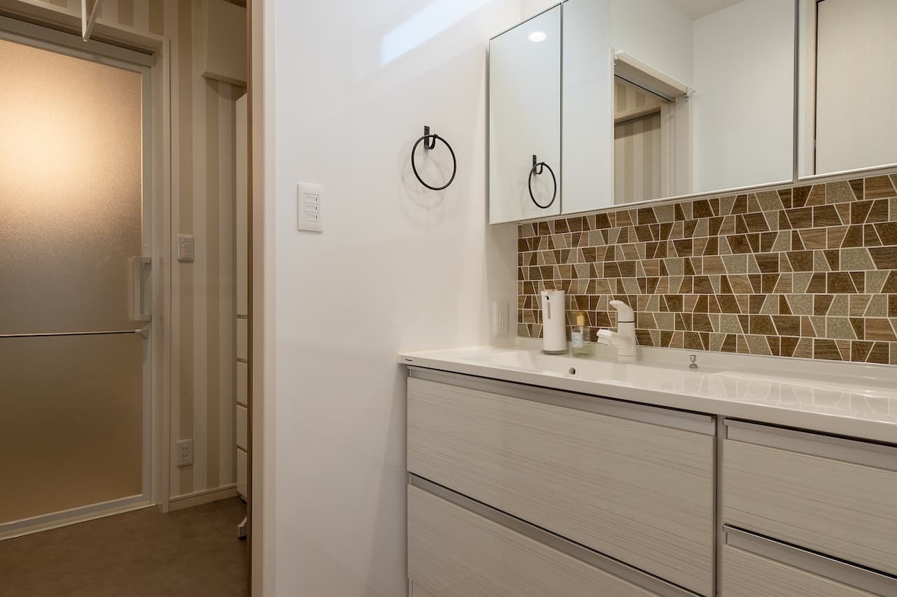 洗面室と脱衣室。脱衣室はランドリールームとしても活用し、乾いた衣類などは隣につくった大きなファミリークローゼットにしまうことができる。「この家で暮らしてから洗濯家事がとてもラクにできるようになりました」と夫人