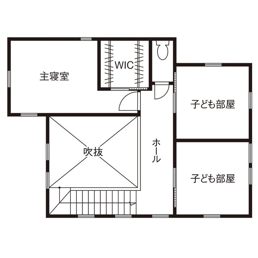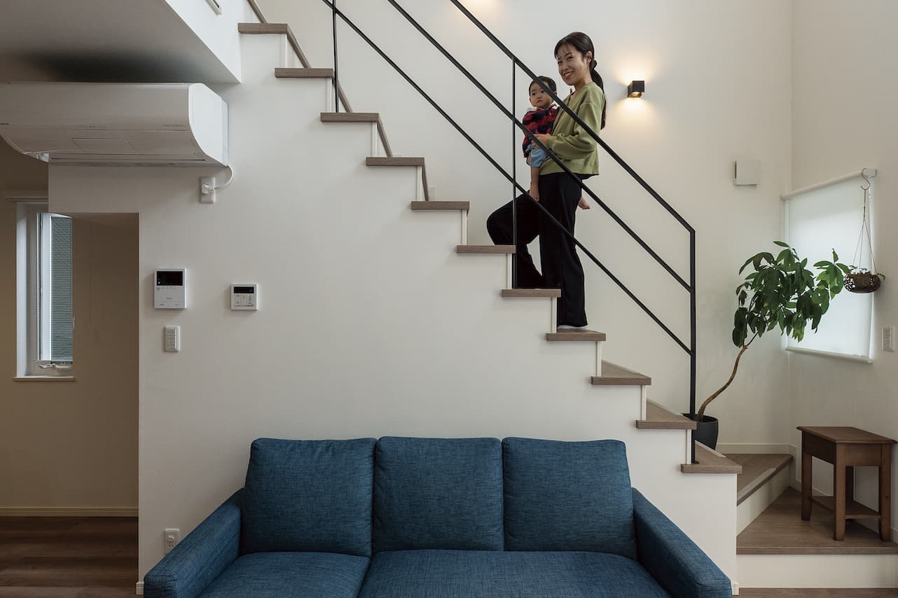 採光の確保と圧倒的な開放感を生み出す吹き抜けはご夫妻揃っての希望を叶えたもの。「2階にいても1階の様子が分かる吹き抜けがとても安心できて気に入っています。子どもも楽しそうに下から上を見上げて、2階にいる家族と会話をしたりコミュニケーションを取ったりするのが嬉しそうです」と夫人