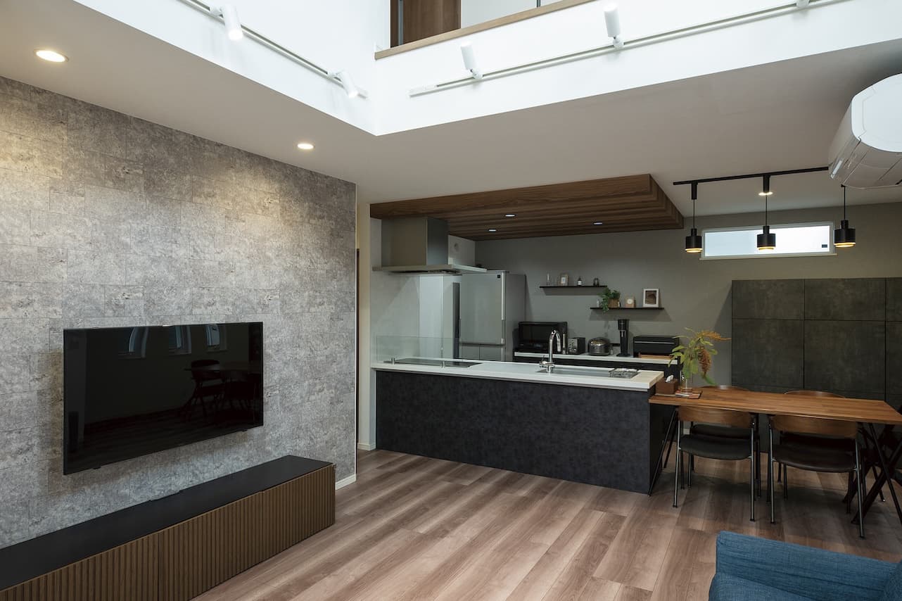 黒と茶、グレーを基調にまとめたスタイリッシュな空間を実現。「壁掛けテレビの下地位置や、キッチン背面の飾り棚の配置を細かく提案してくれたおかげで、すっきりとした空間になりました」とTさん。深みのあるブルーのソファが程よいアクセントとなり、上質さと落ち着きが共存する心地よい空間に仕上がっている