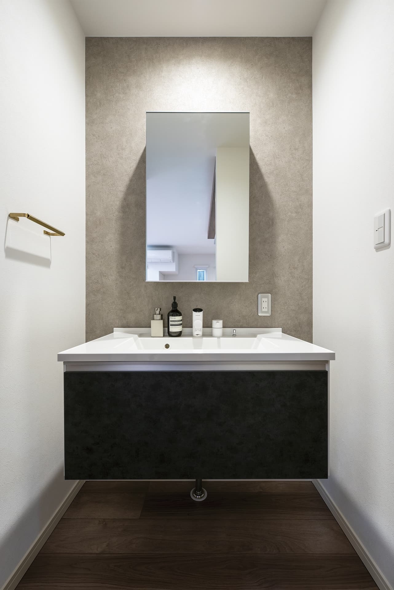 黒と木調の外壁を組み合わせた、落ち着きと上質感をまとった外観。「賃貸時代は部屋干しが多く、あまり使わないベランダの掃除がとても負担になっていました。だから今回は“ベランダのない家”を選びました」と夫人。脱衣室や2階のホールに室内干しスペースを設けることで、日々の家事がよりスムーズにこなせる、暮らしやすさにもこだわった住まいとなっている