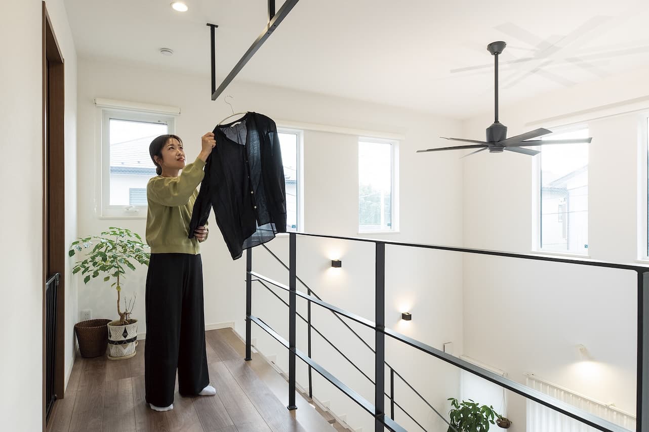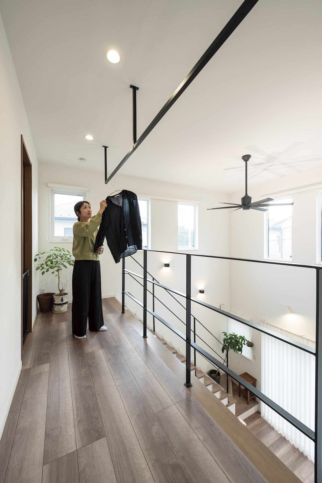 2階のホールは洗濯物干しにも活用。「乾燥機で乾かないものはホールで干したりしますが、吹き抜けのおかげもあり乾くのが早くて助かっています。掃除の手間がかかるベランダをつくらなかったことで、ベランダの掃除が不要になっただけでなく天候や花粉などの付着の心配をしなくて良いので、本当にストレスが少なくなりました」
