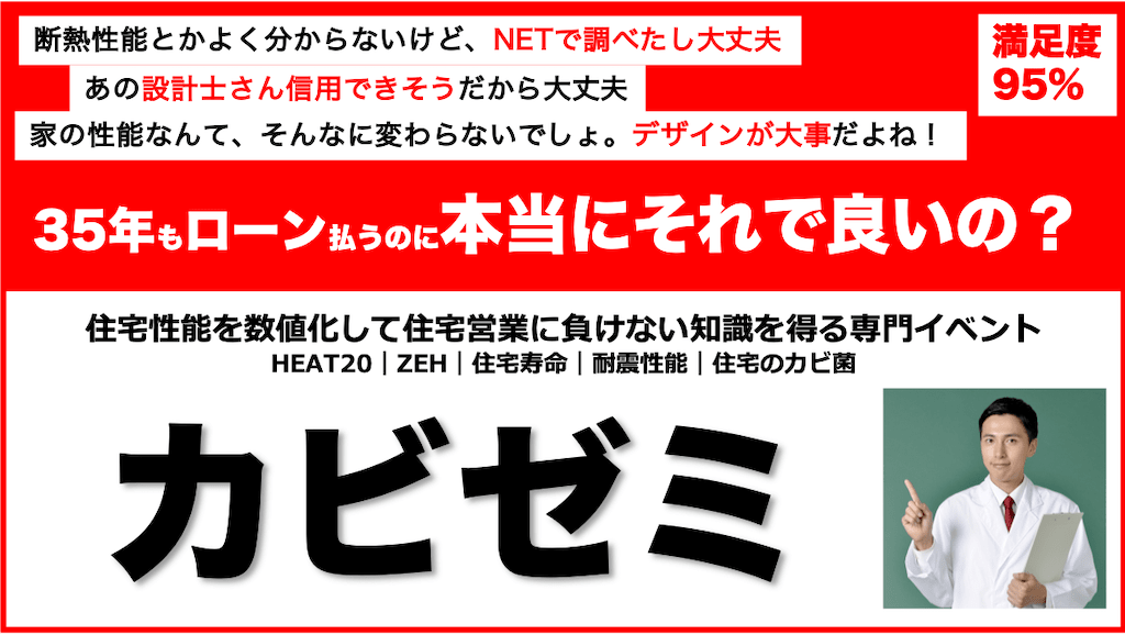 三陽工務店のカビゼミでは、お客様がハウスメーカーを検討する上で必要な知識を90分でレクチャーしています。上記の質問内容は、もちろん正しい知識で答えられるようになります。他の会社に行かれた際に、必ず役に立つはずです。