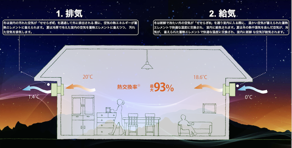 冬は新鮮で冷たい外の空気が「せせらぎ®」を通り室内に入る際に、 温かい空気が蓄えられた蓄熱エレメントで快適な温度に交換され、 室内に給気されます。夏は外の熱や湿気を含んだ空気が、冷気が、 畜えられた蓄熱エレメントで快適な温度に交換され、室内に新鮮 な空気が給気されます。