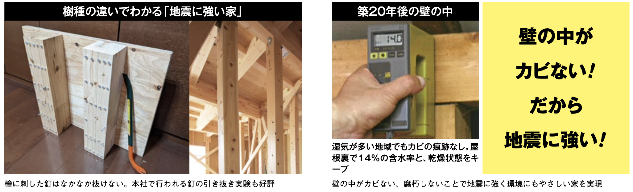 含水率が20%を超えると木材の腐れやシロアリの被害を受けやすくなります。また、木材の含水率が高いと木の強さ(強度)も弱くなります。耐震性には木材を乾燥させることがとっても大事なことです。(本当に重要です。)