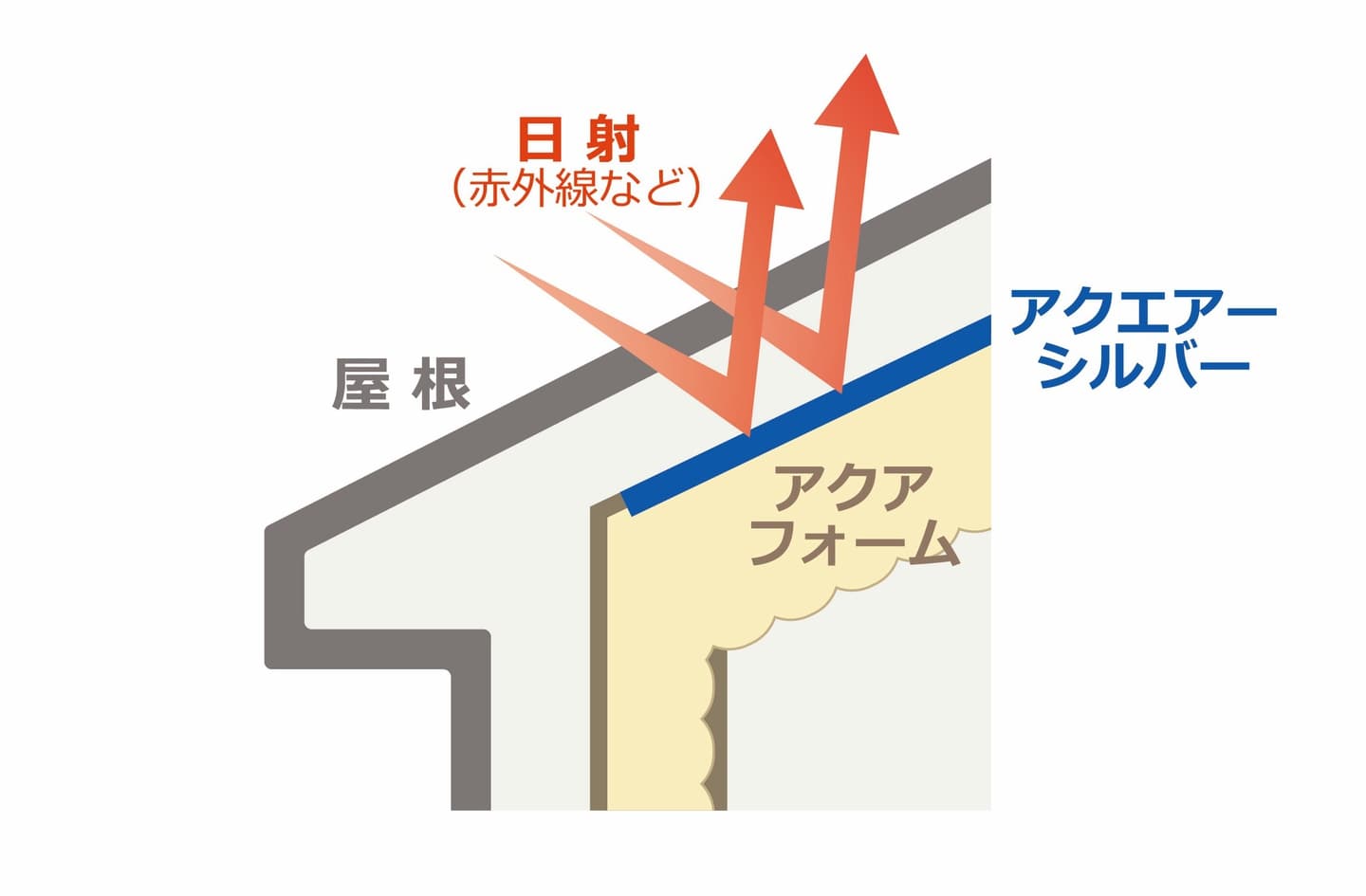 反射して、小屋裏への熱の侵入を防ぎます。アクエアーシルバーの施工部分と非施工部分で表面温度は 7 度の差