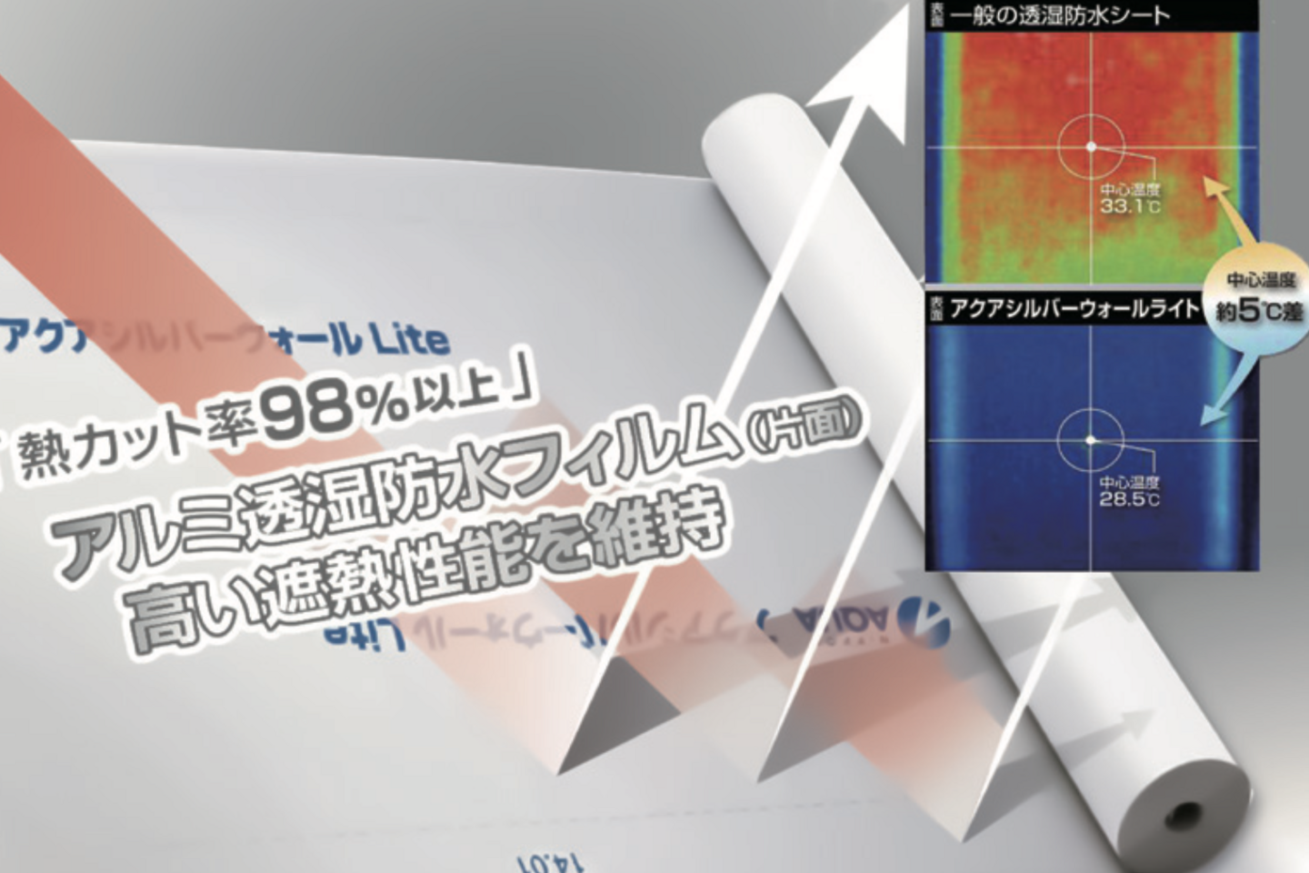 無数のアルミ粒子が熱線を反射し、熱カット率98%を実現する高耐久遮熱型透湿防水シート「アクアシルバーウォールライト」。