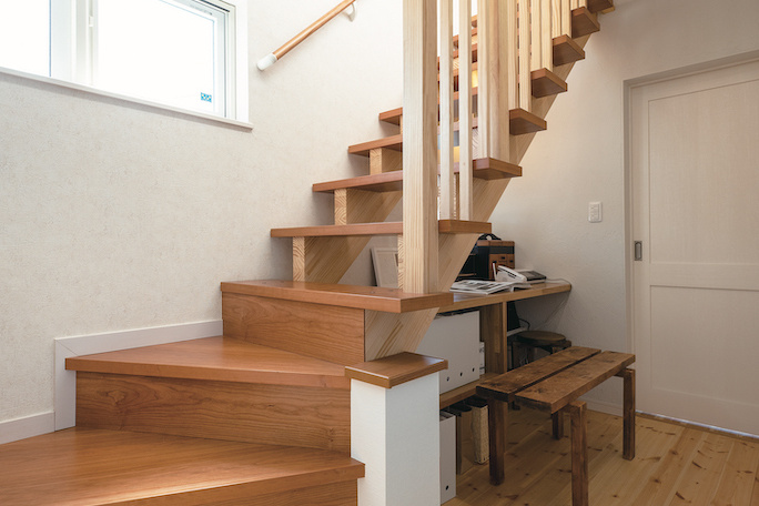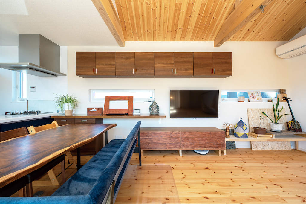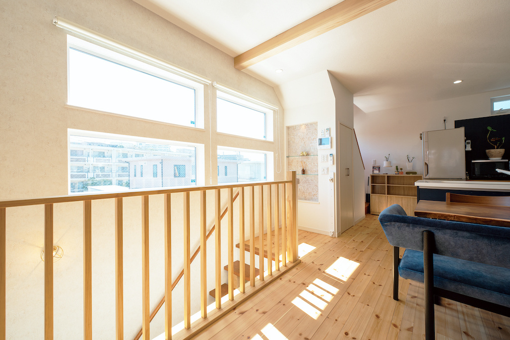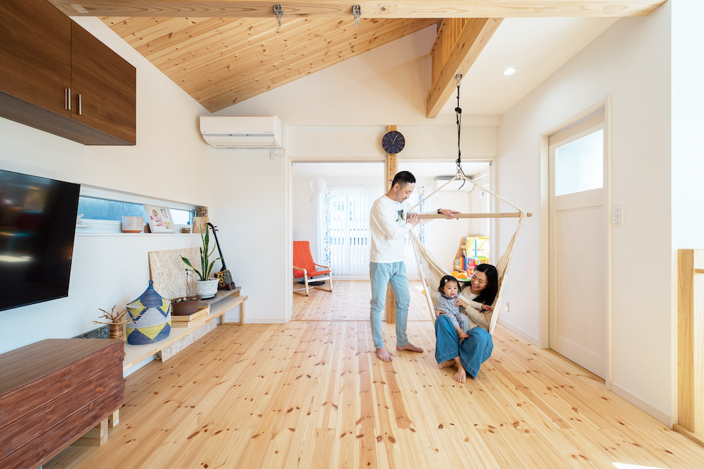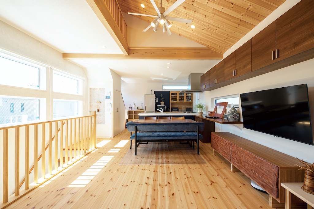 パインの無垢床がぬくもりを醸し出す2階のLDK。「日当たりを考慮して2階LDKにしました。リビング階段、梁や勾配天井なども希望を叶えられました」とHさん。エアコン1台で冬暖かく過ごせる断熱性能の高さにもお喜び