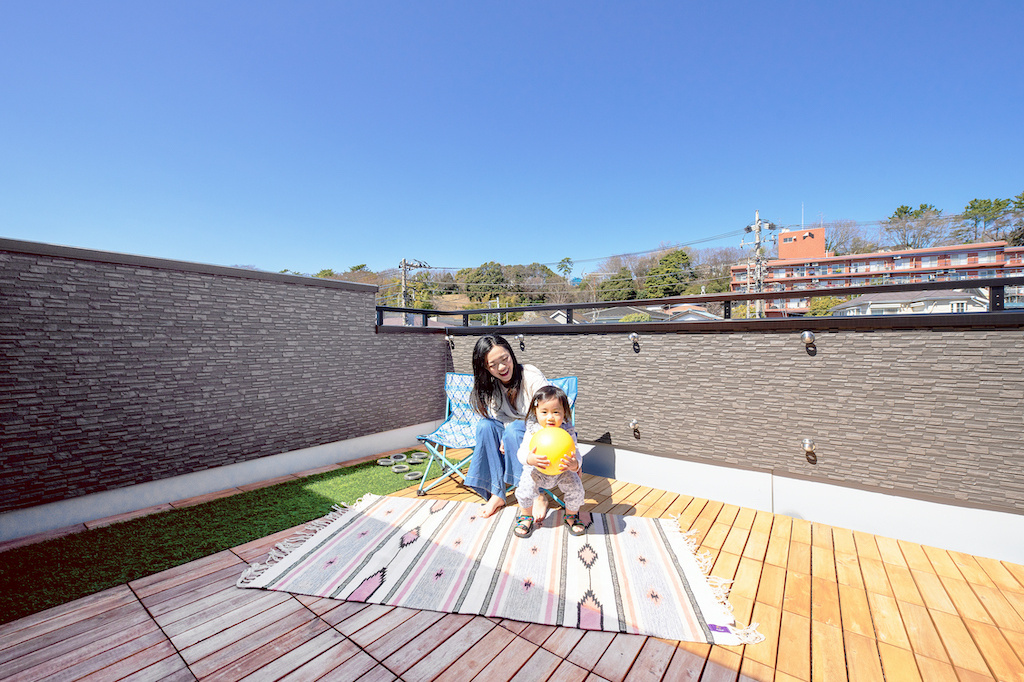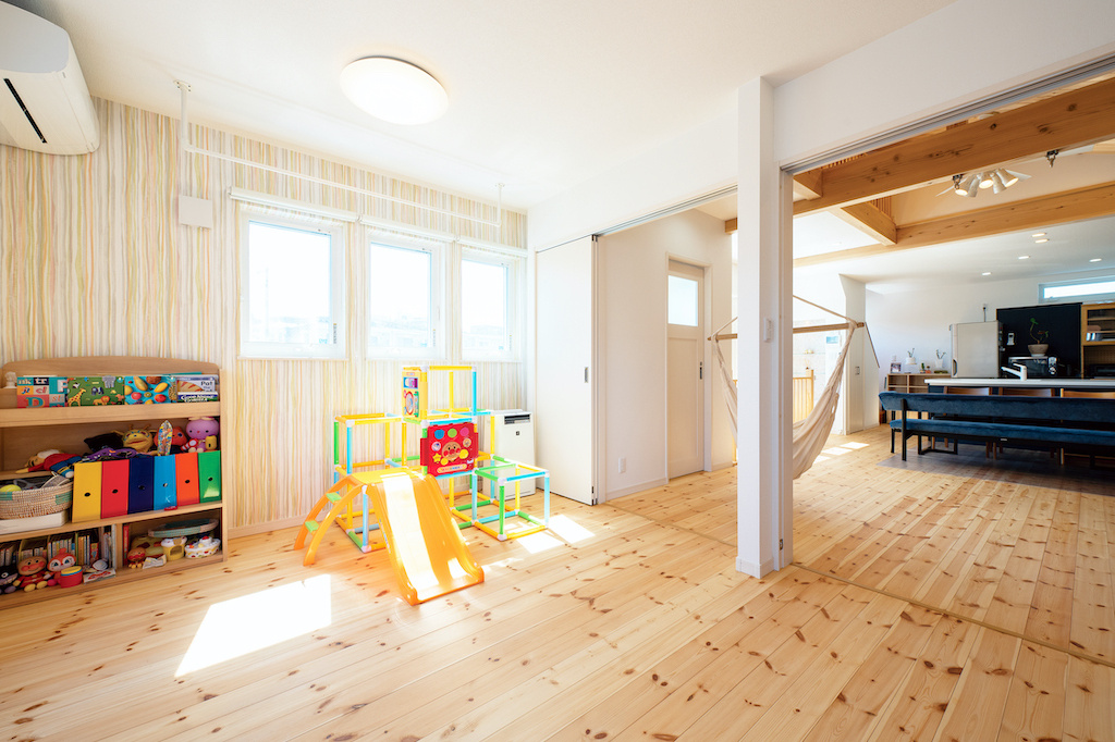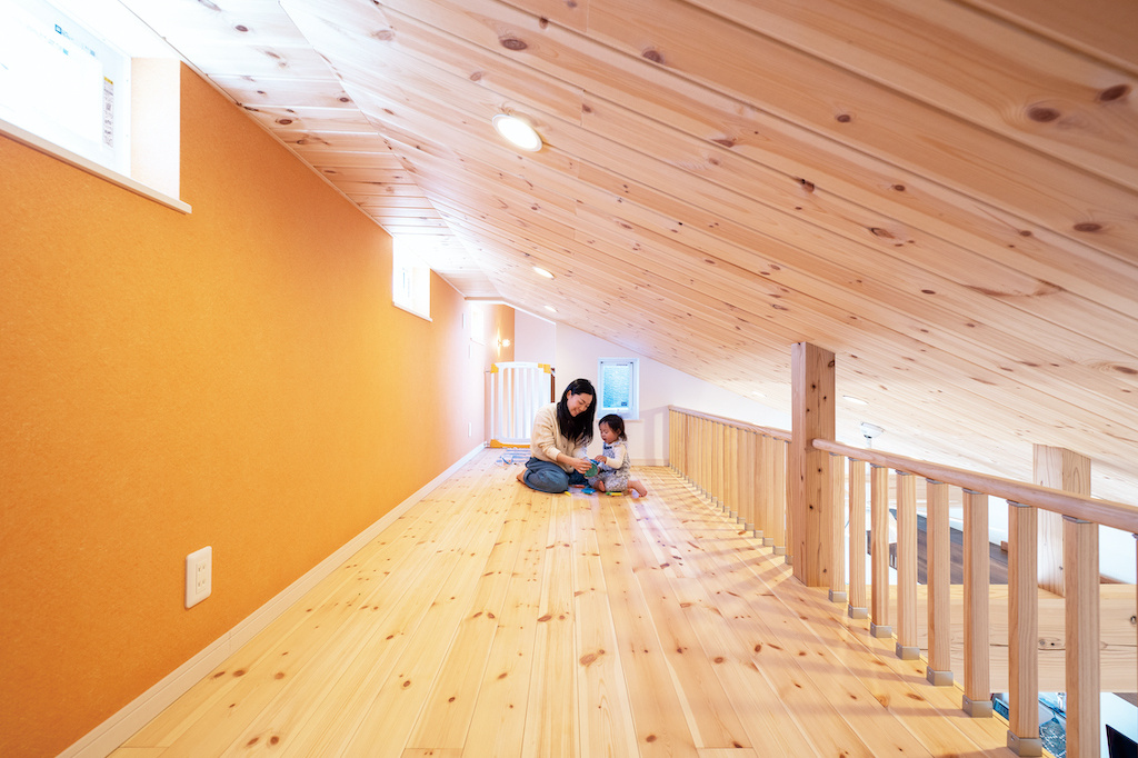 お子さんの遊び場所として設けた8帖の広さのロフト。断熱性能が高い同社の家は、収納のほかに趣味のスペースなどとしても十分に活用できる。見ているだけで天井の杉板から香りが漂ってきそうな、ぬくもりのある空間
