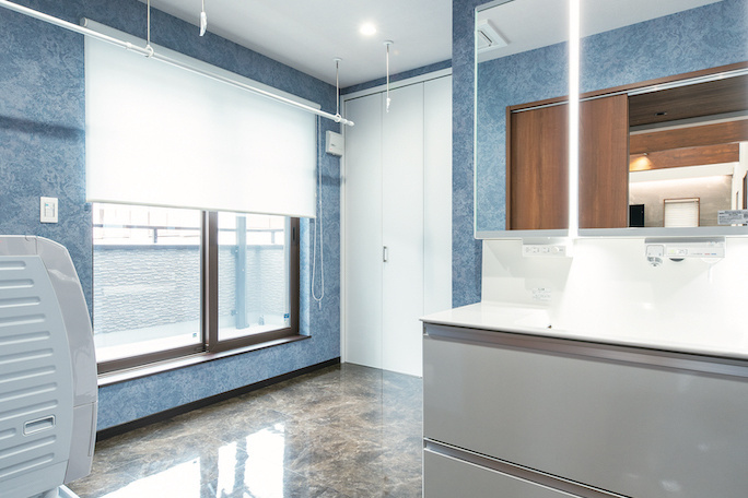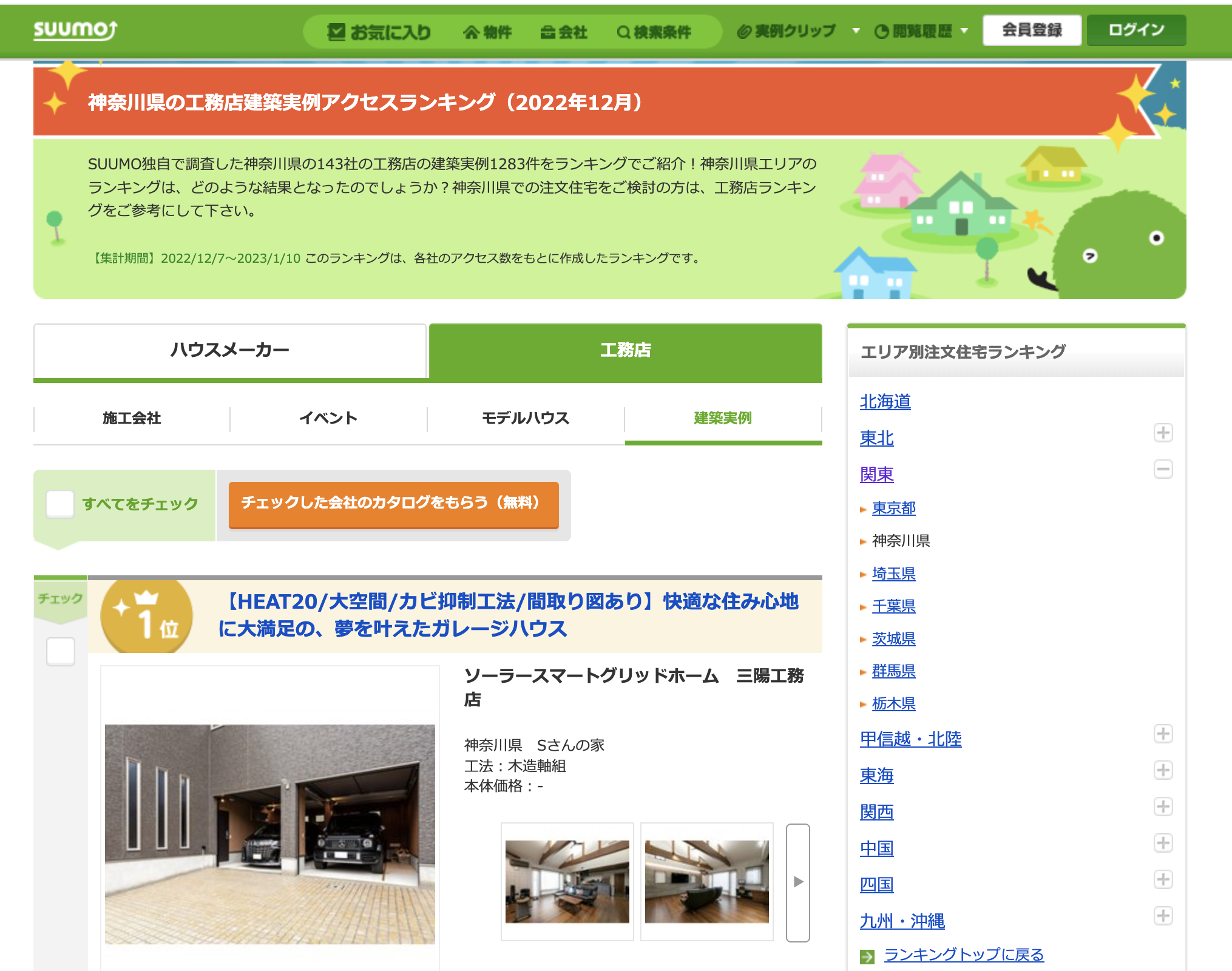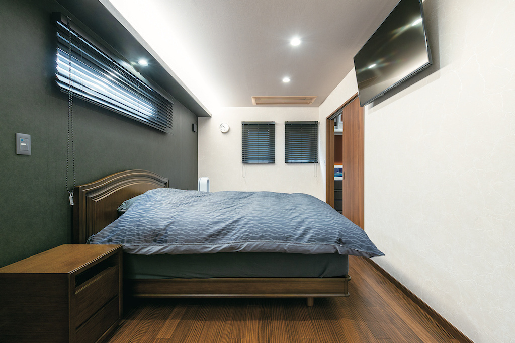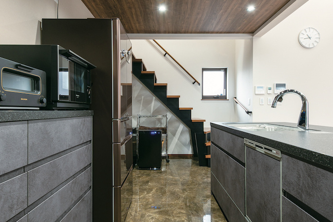 高さ最大3.8mの勾配天井が開放感を生み出す2階のLDK。無垢の床や力強い梁がぬくもりと落ち着きを醸し出す。標準仕様でZEHを上回る高い断熱性能を持つため、このような大空間でもエアコン1台で快適&省エネに過ごせるのも三陽工務店の家の魅力