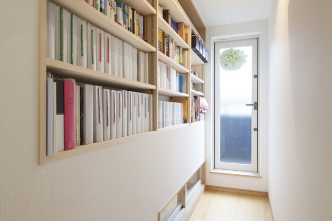 廊下には造作家具で本棚を設置。どんなご要望の造作でも三陽工務店では、大工さんが丁寧に作り上げます!