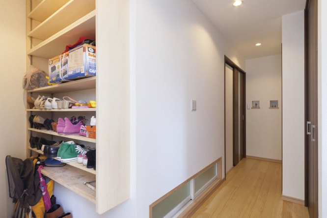 玄関収納は引き戸・開き戸・ドア無しなどお好きなように設計する事が可能です。また、収納内のレイアウトもご希望通りに仕上げます。