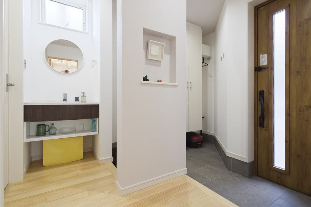 玄関にプランニングした趣味の道具や部活動具をしまえる土間収納、入ってすぐに手洗いがあるのもポイントです