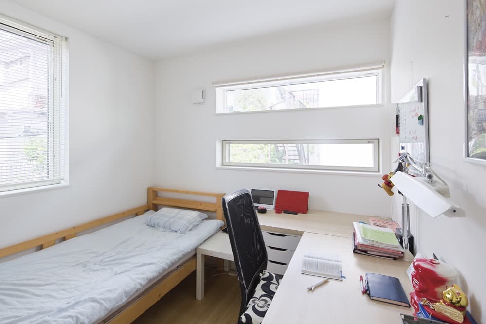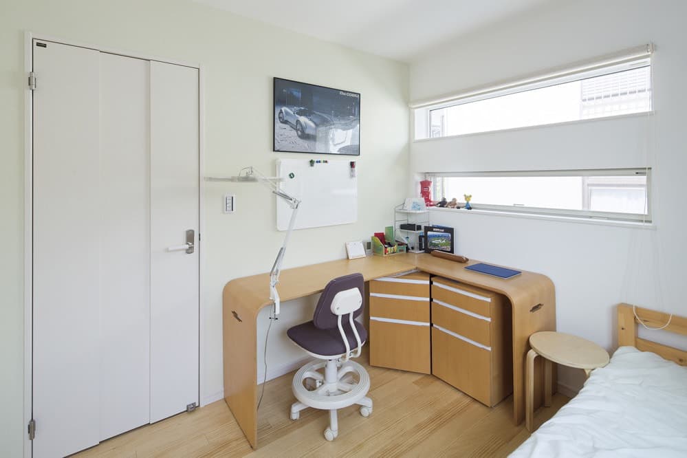 横に長い窓を2つ重ねる事により、明るく解放的な洋室となっている