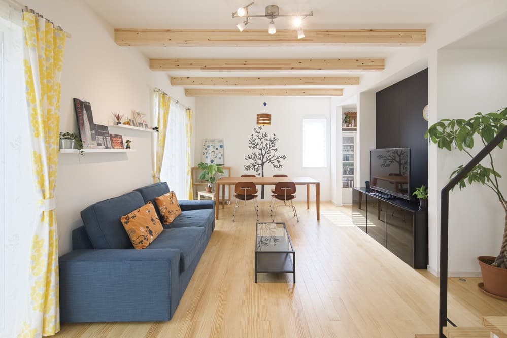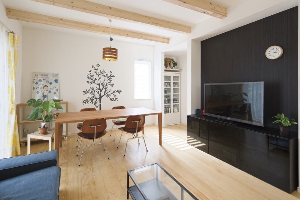 窓を高く、床や壁は明るい色、天井は梁を見せる等の工夫でより明るく開放感あるLDKに。