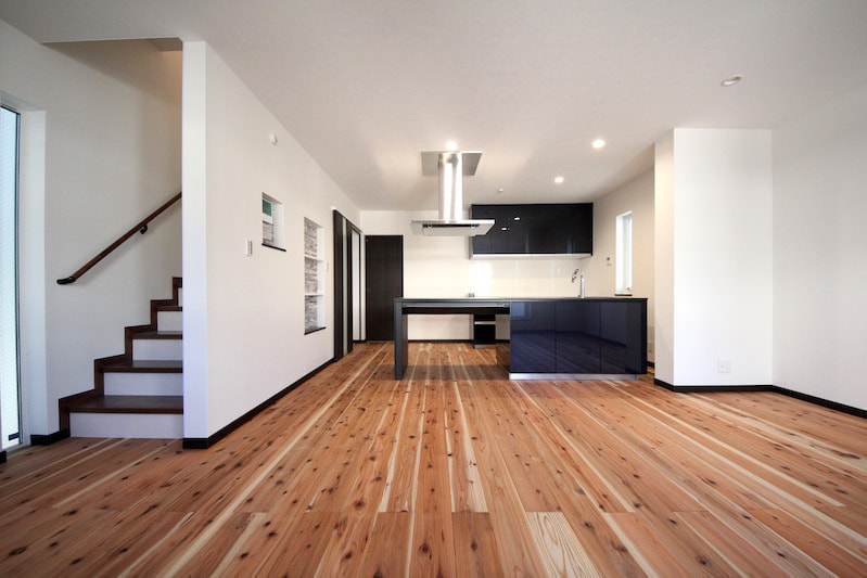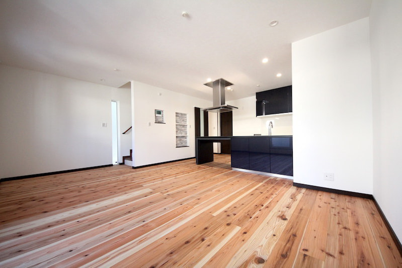 広々快適なリビングルームには、無垢の床をチョイス。自然素材を使用したコーティング剤を使用して、艶のある上品な床になっています。