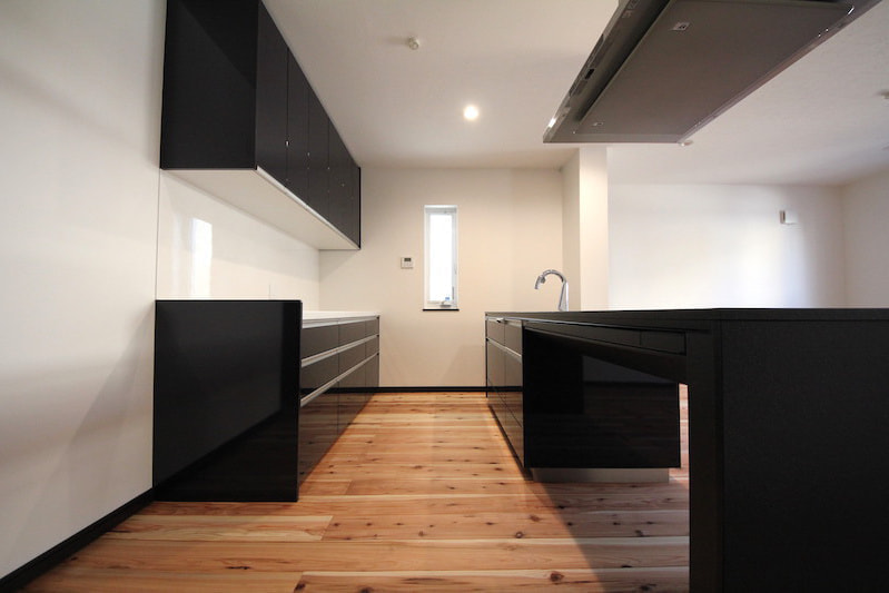 キッチンスペースには、大型のカップボードも配置。鏡面仕上げの面材は、キッチンとお揃いで非常に重厚感のあるキッチンスペースとなっています。