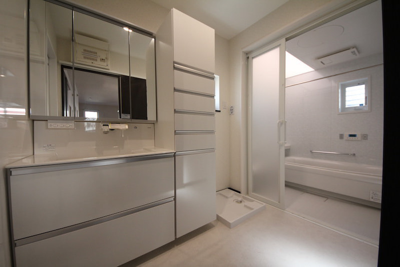 ゆとりある洗面スペースには、収納をたくさん配置。生活雑貨やタオルなどの収納に非常に助かります。