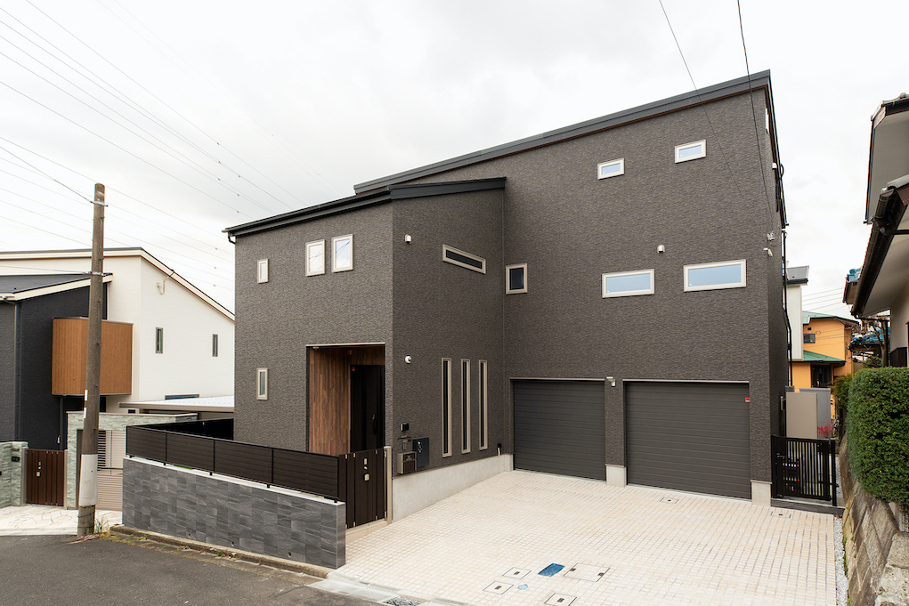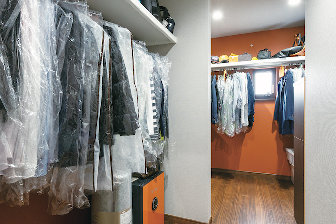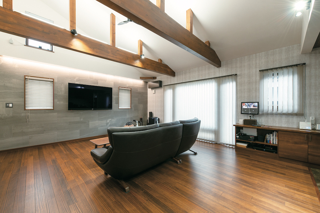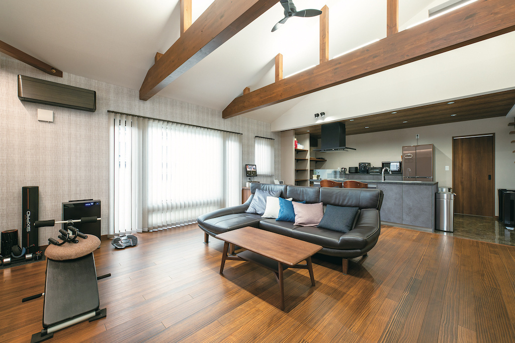 高さ最大3.8mの勾配天井が開放感を生み出す2階のLDK。無垢の床や力強い梁がぬくもりと落ち着きを醸し出す。標準仕様でZEHを上回る高い断熱性能を持つため、このような大空間でもエアコン1台で快適&省エネに過ごせるのも三陽工務店の家の魅力