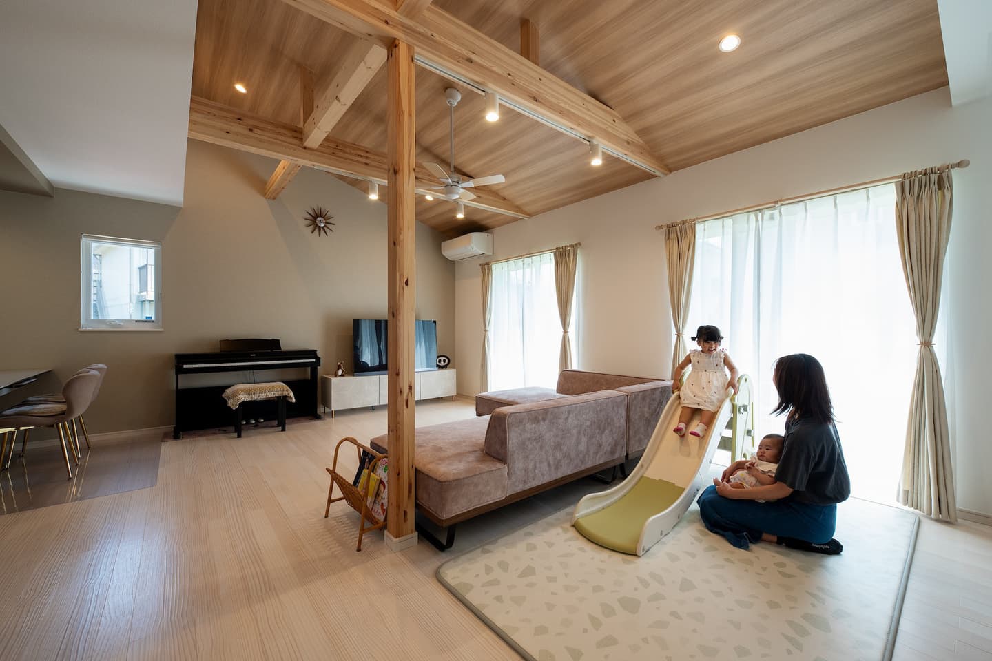 ソファの後ろはお子さんの遊び場として活用。キッチンで料理をつくりながらでも目が届くのでママも安心だ。「勾配天井はご提案いただいたものなのですが、とてもいいですね」とSさん。「音などを気にせずに子どもをのびのびと遊ばせられます。ピアノの音を気にすることなく弾かせることができるのも嬉しいですね」と、夫人も断熱性能、防音性能の高さを評価する