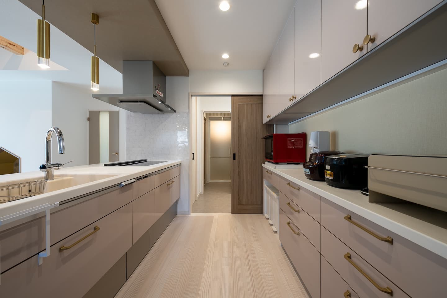 キッチン、洗面室、ランドリールームを兼ねた脱衣室と家事スペースを集約して、家事がラクにできる家に。標準仕様でグレードが高いキッチンを選べたことも同社に惹かれた理由のひとつ。キッチンのお洒落な照明はご夫妻の支給品