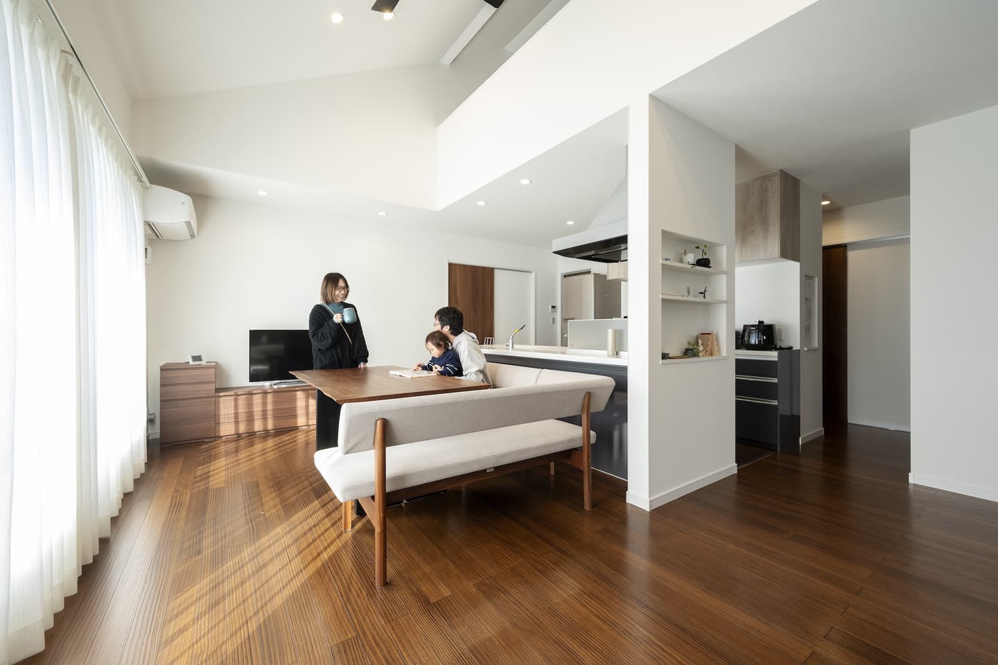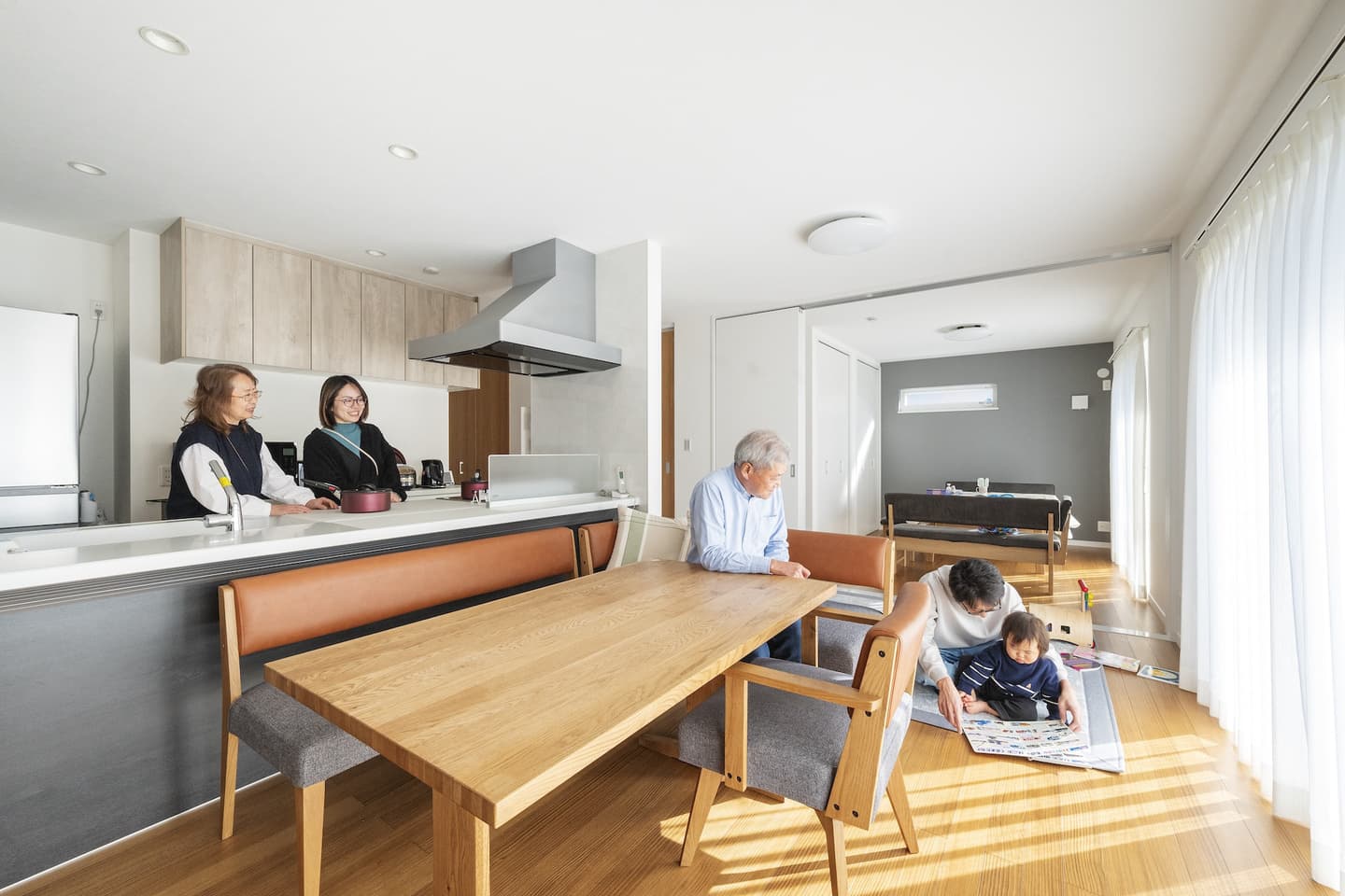1階の親世帯のLDKでくつろぐご家族。「とても明るくて暖かい家です。遊びに来た友人にも『動線がいい』『脱衣室で洗濯物を干せるのが便利』などと好評です」とお母様。「夫が仕事で遅い時など、1階で一緒に食事をすることが多いですね」と夫人。二世帯住宅での暮らしを楽しまれている