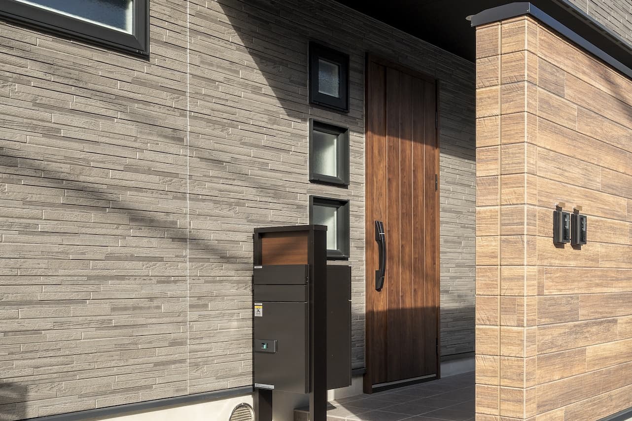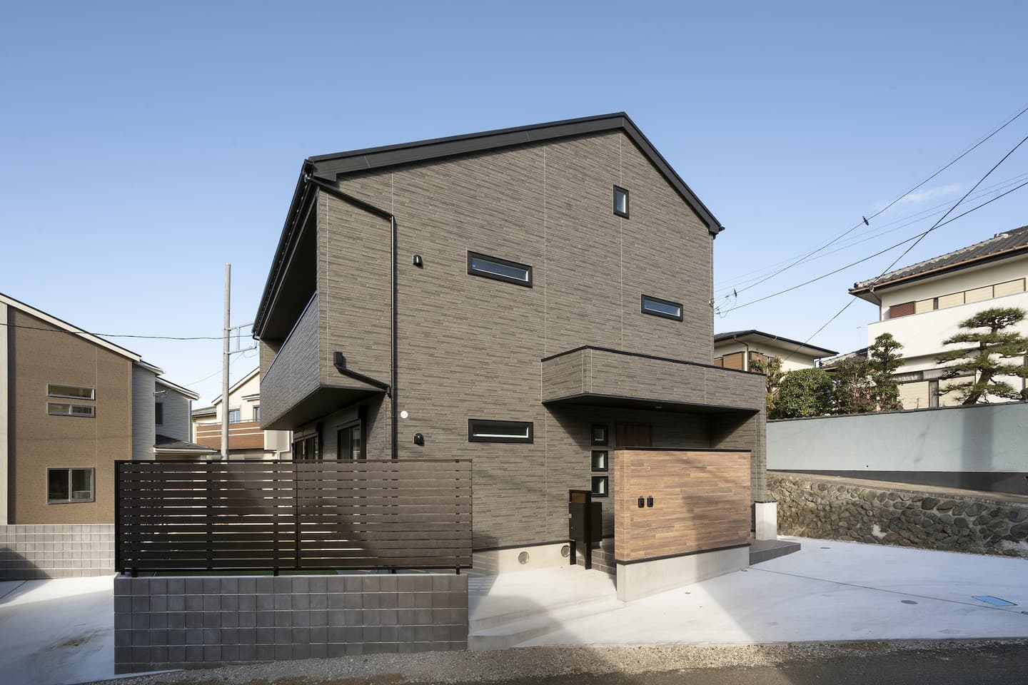 堂々としたフォルムが住宅街の中でも目を引くK氏邸外観。「汚れが目立ちにくい落ち着いた色合いの外壁を希望しました」とKさん。汚れが付きにくい光触媒の外壁はメンテナンスコストの低減にも貢献。玄関ポーチ上の重厚な庇も希望を叶えたもの