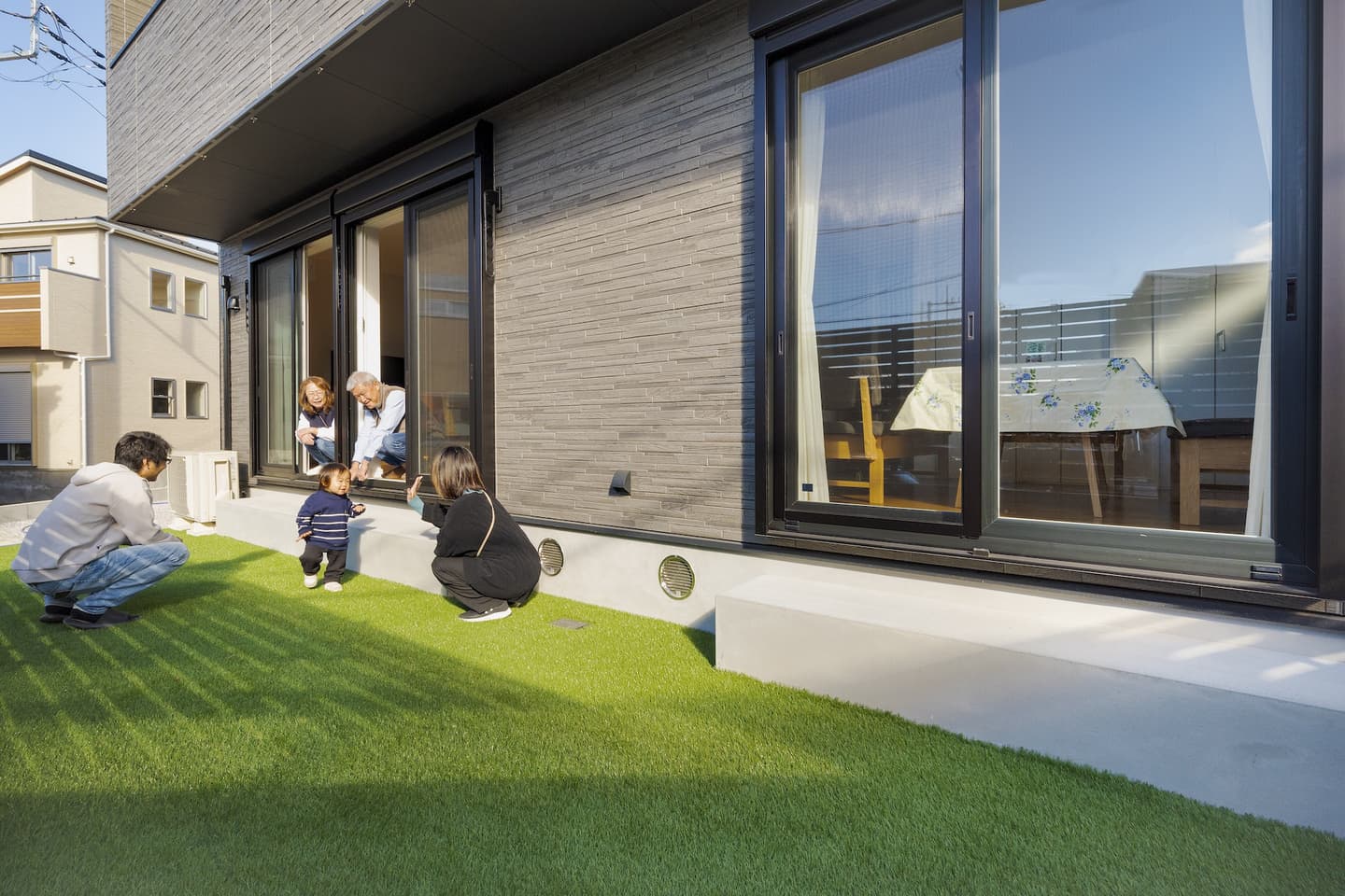 人工芝を敷いた庭で遊ぶご家族。一緒に遊んだり、用事のため外出する時などに両親に子どもを見てもらいやすいのも二世帯住宅の特徴。「孫がいると生活が明るくなりますし、元気な足音が聞こえると楽しい気分になりますね」とお父様。「子世帯が一緒だと安心して暮らせます」とお母様