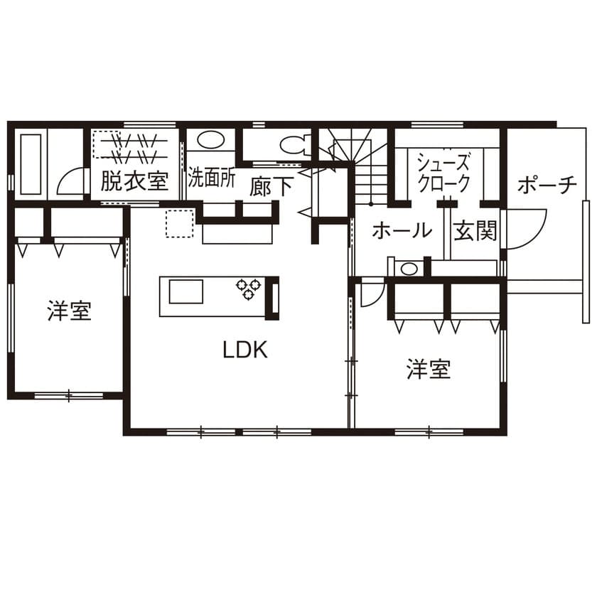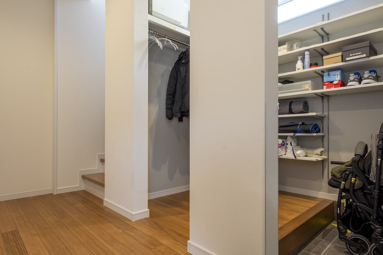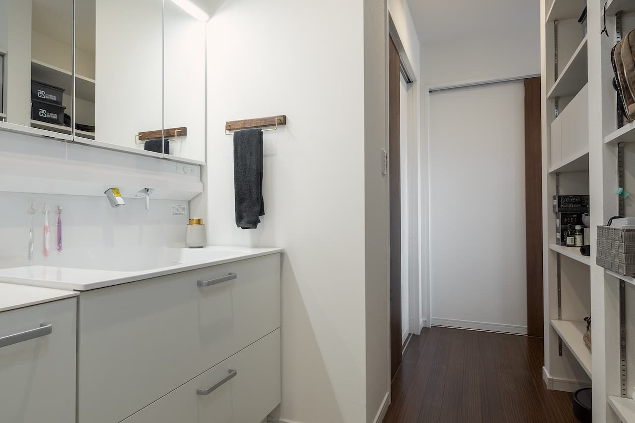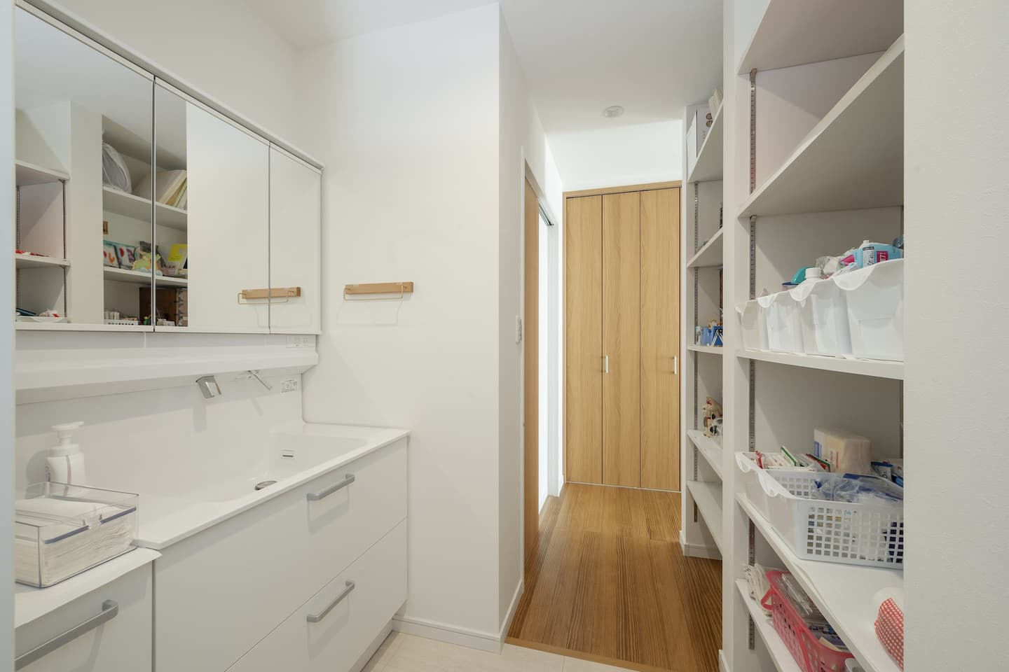 1階と同様に、2階もキッチン裏の廊下に大容量の収納を設置。「回遊動線がとても便利です。天気が悪い日にランドリールームの機能を持たせた脱衣室で中干しができるのもいいですね」と夫人。上下階で水回りの位置を揃えて生活音に配慮した間取りになっているのも設計のポイント