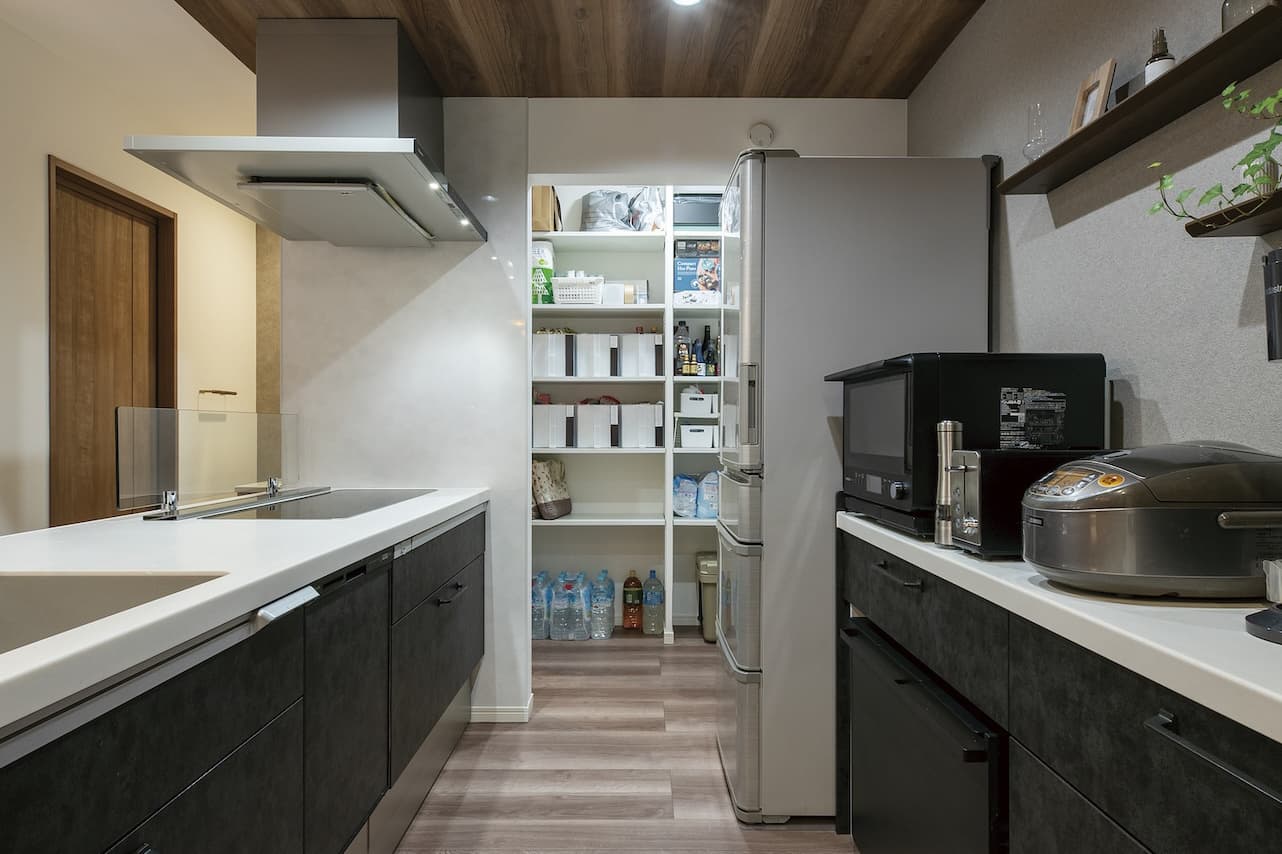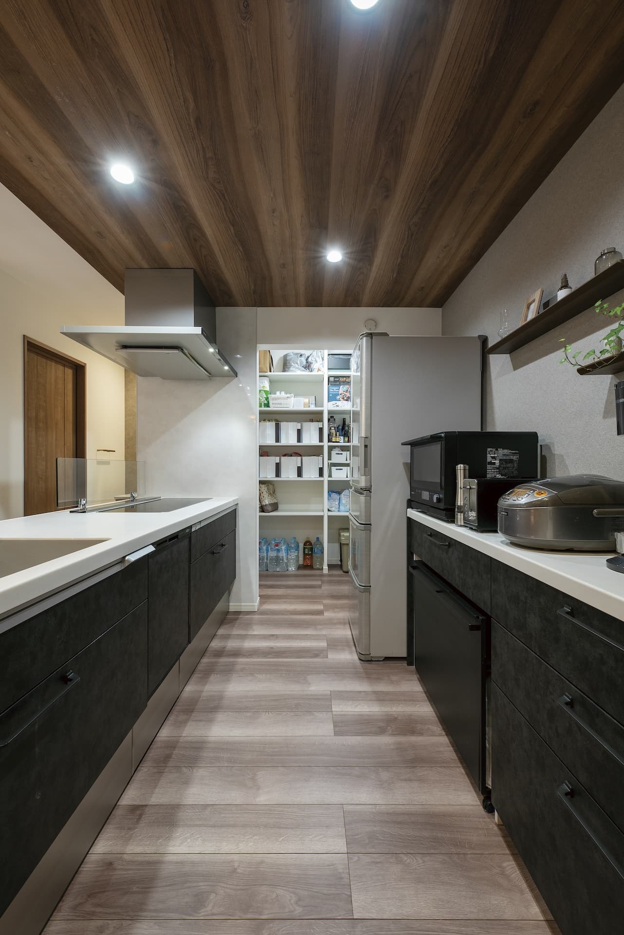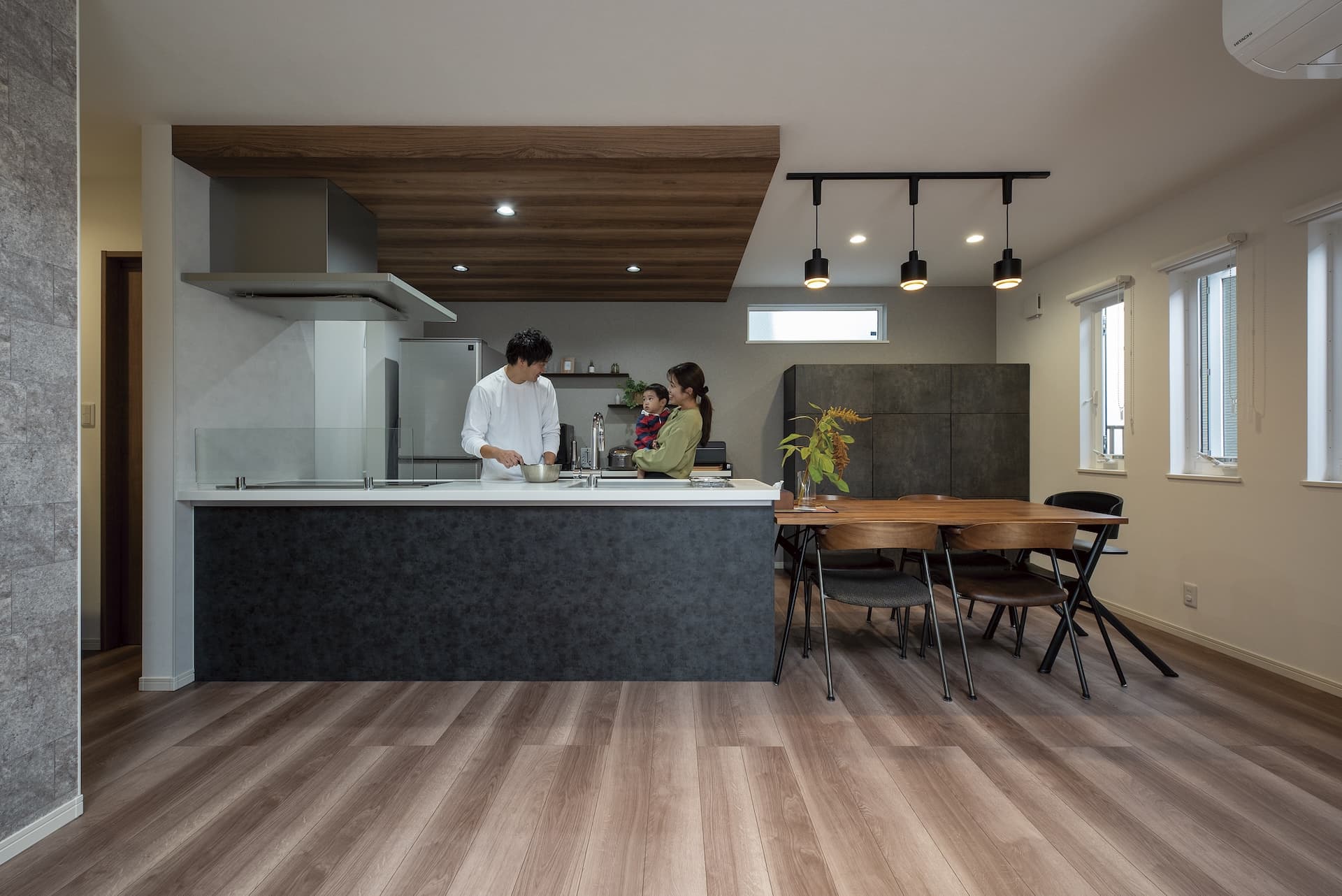 デザイン性の高い下がり天井と、キッチンとダイニングテーブルを横並びにした家事効率のよいレイアウトで、ご夫妻の希望をかたちにしたスタイリッシュなダイニングキッチン。「IHクッキングヒーターにしてから料理がより楽しくなりましたし、買い物帰りに食材をサッと置けるのも便利です」と夫人。使い勝手と美しさが調和した、心地よい空間を実現した