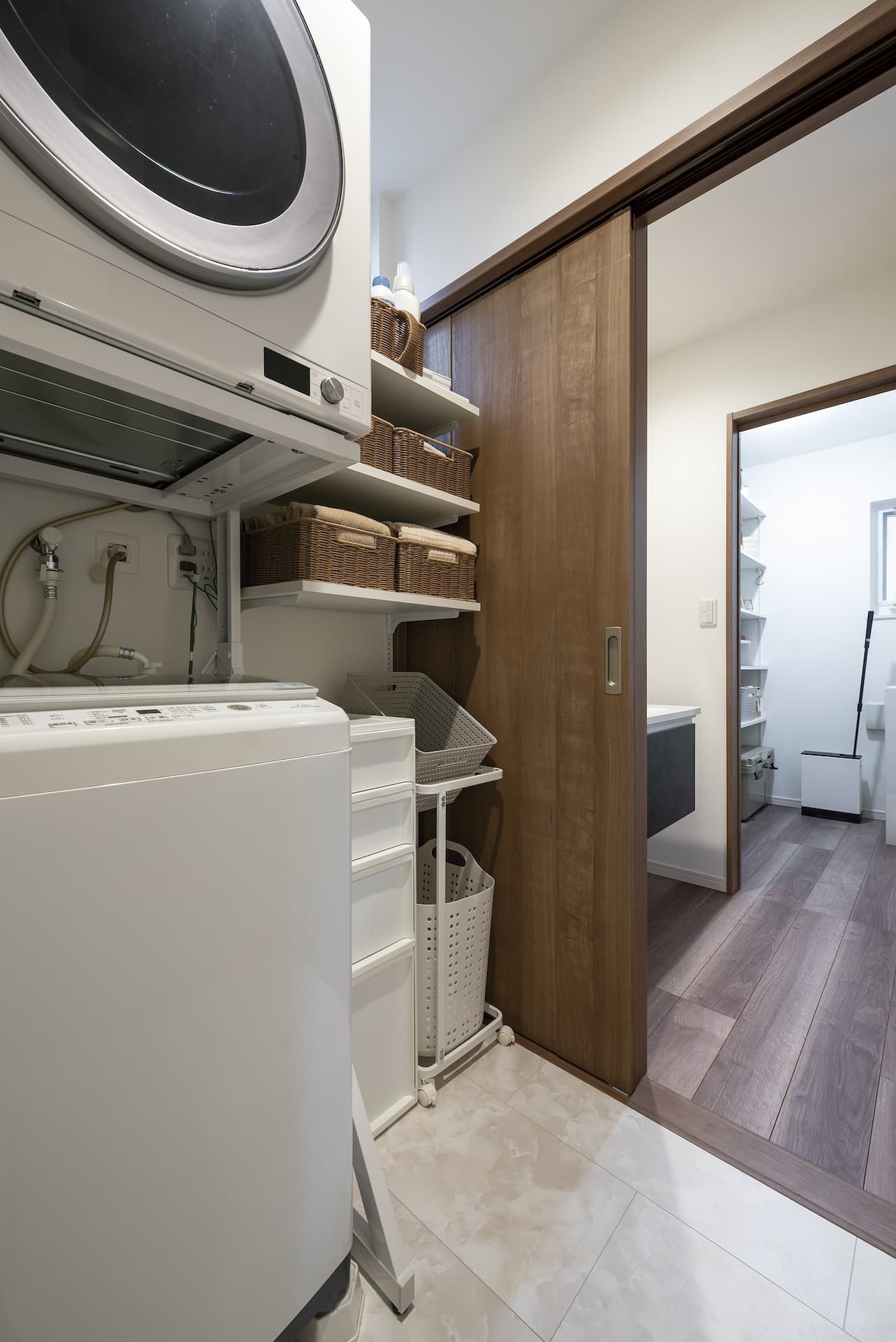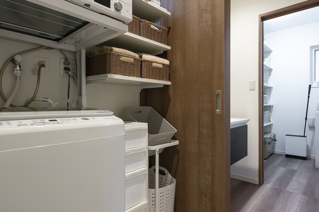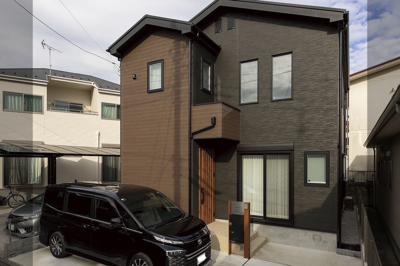 黒と木調の外壁を組み合わせた、落ち着きと上質感をまとった外観。「賃貸時代は部屋干しが多く、あまり使わないベランダの掃除がとても負担になっていました。だから今回は“ベランダのない家”を選びました」と夫人。脱衣室や2階のホールに室内干しスペースを設けることで、日々の家事がよりスムーズにこなせる、暮らしやすさにもこだわった住まいとなっている