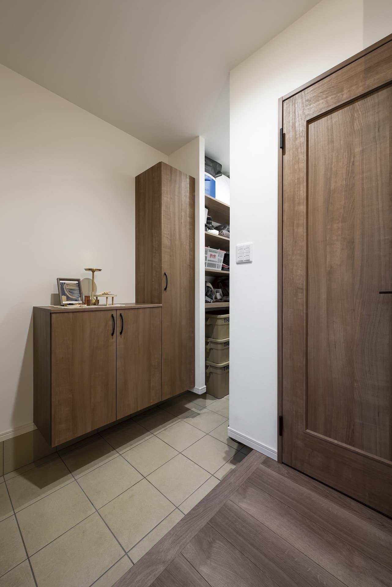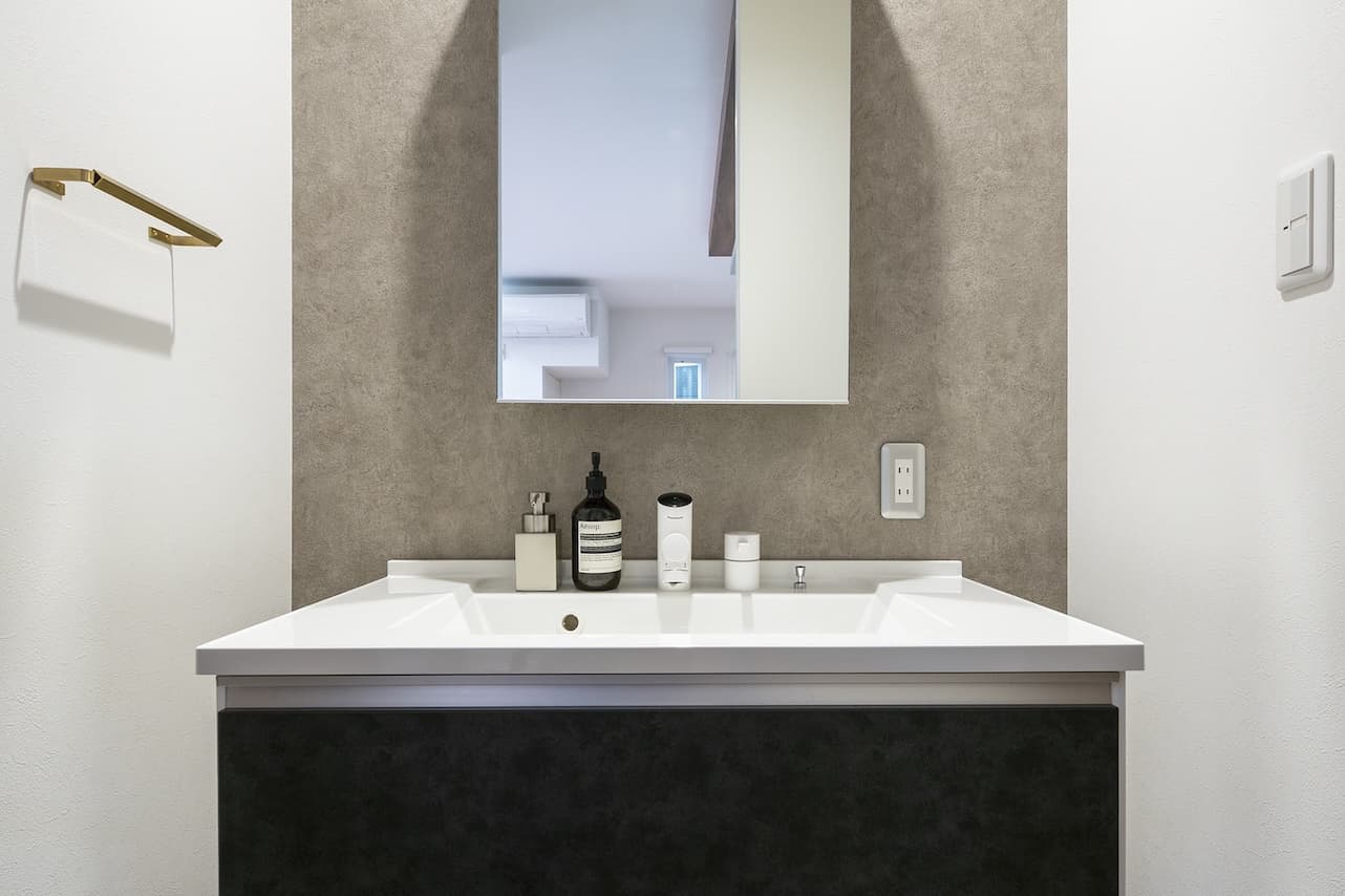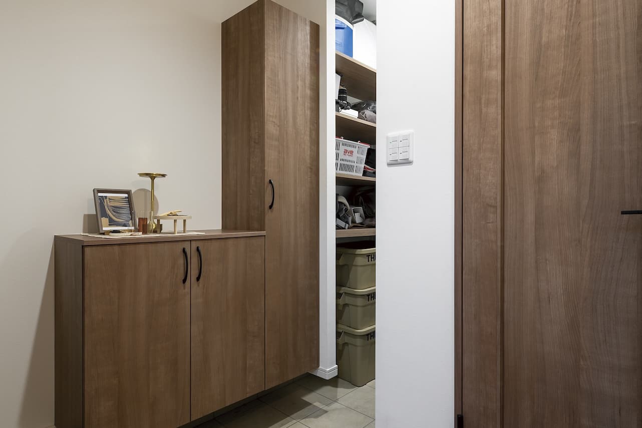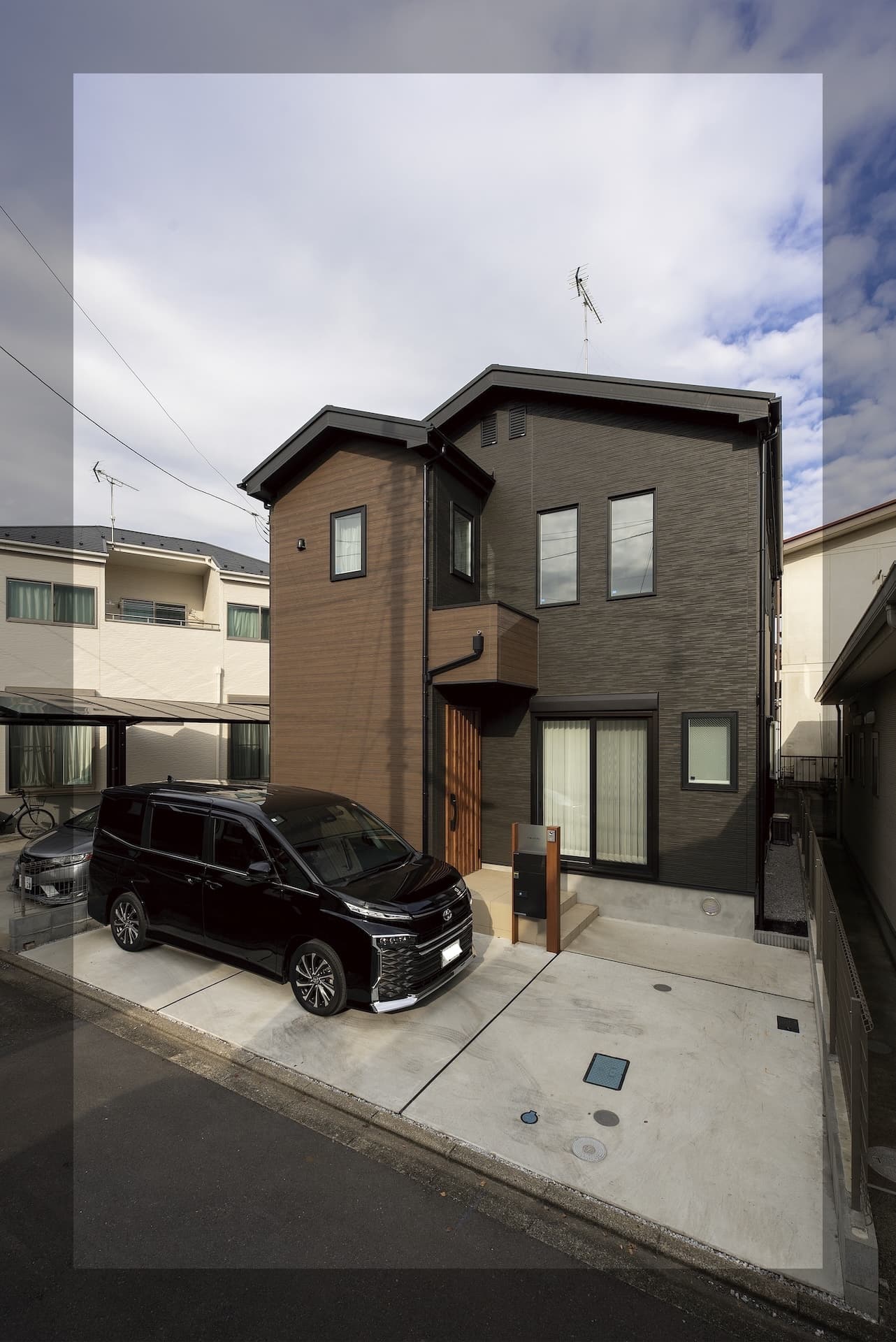 黒と木調の外壁を組み合わせた、落ち着きと上質感をまとった外観。「賃貸時代は部屋干しが多く、あまり使わないベランダの掃除がとても負担になっていました。だから今回は“ベランダのない家”を選びました」と夫人。脱衣室や2階のホールに室内干しスペースを設けることで、日々の家事がよりスムーズにこなせる、暮らしやすさにもこだわった住まいとなっている