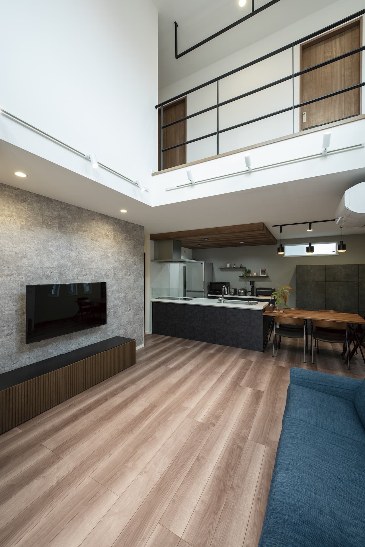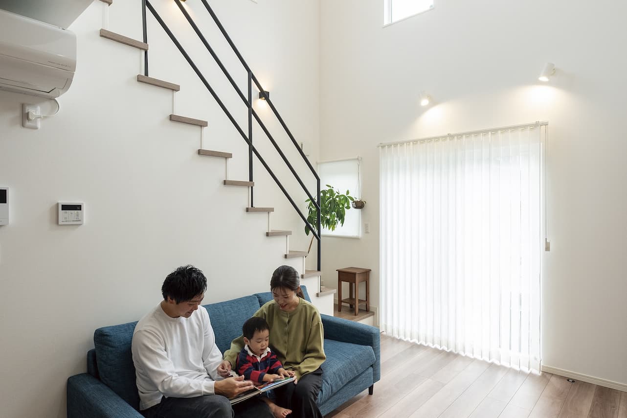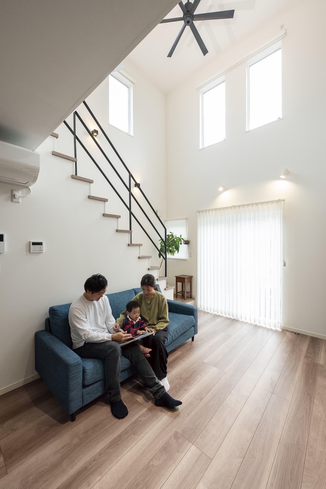 吹き抜けに面した窓や掃き出し窓からの光でとても明るい、ご家族がリラックスして過ごせるリビング。横だけでなく縦方向にも伸びやかな空間にすることで、より一層の開放感を創出。「吹き抜けをつくったことで、家族をいつも感じられるアットホームな空間になりました」