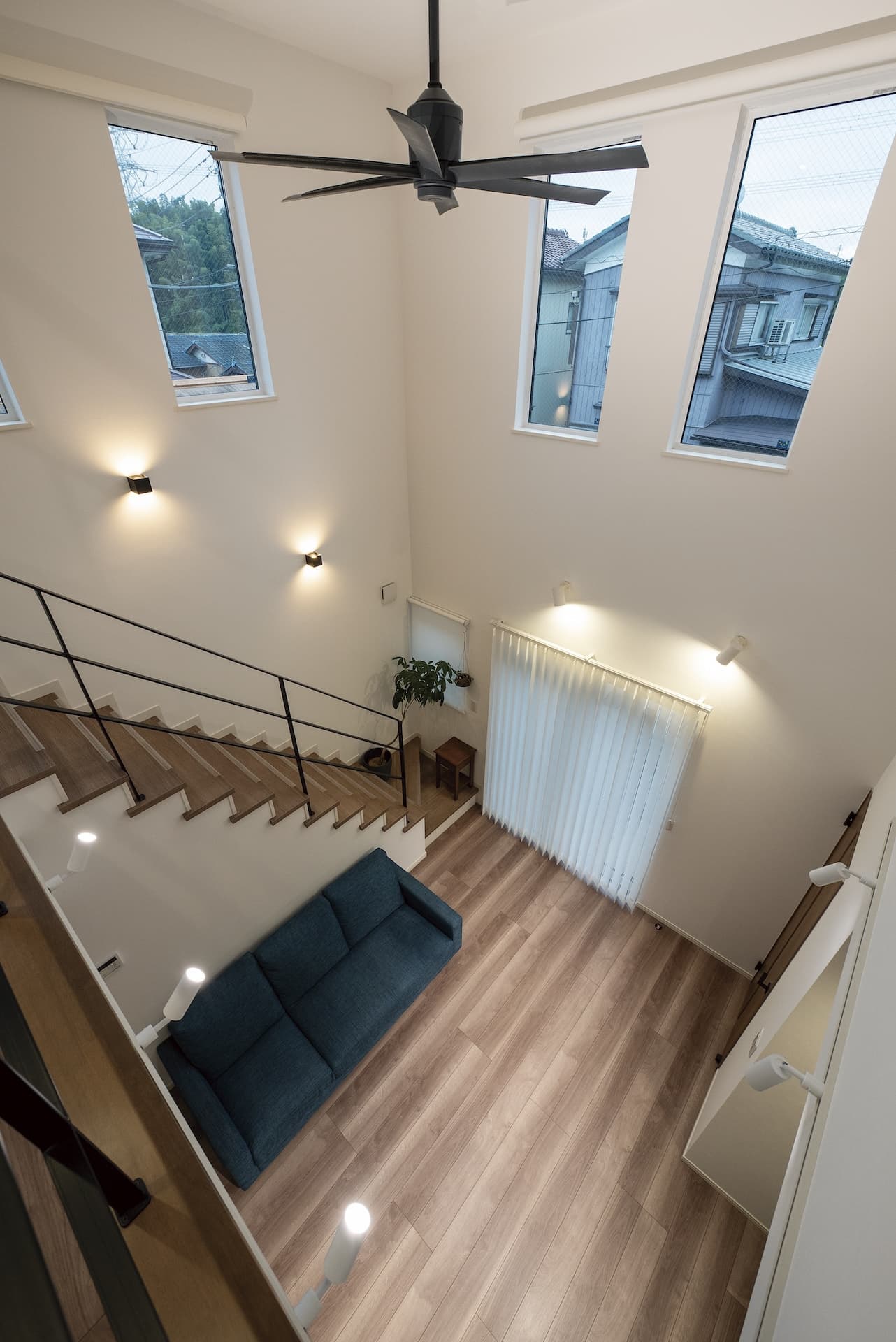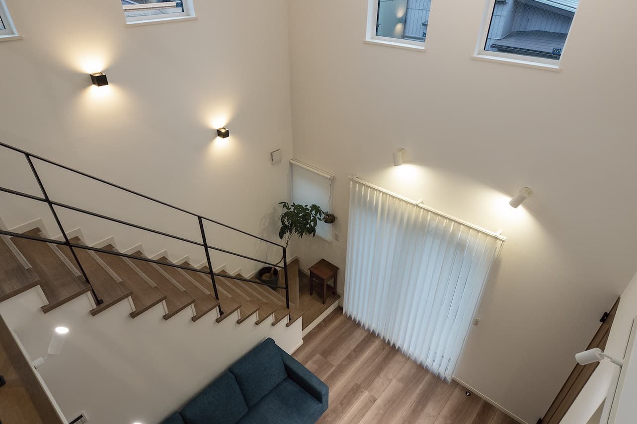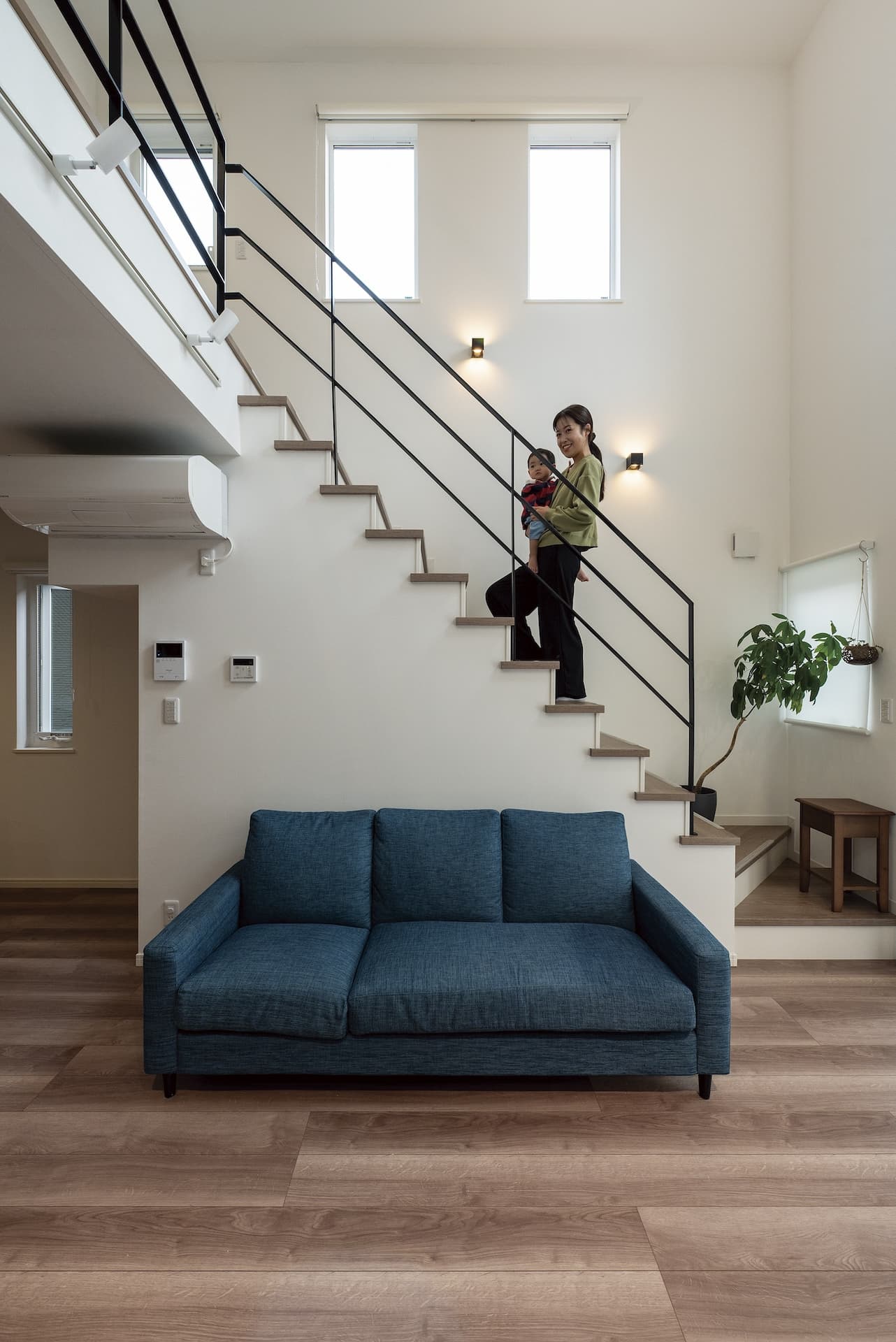 採光の確保と圧倒的な開放感を生み出す吹き抜けはご夫妻揃っての希望を叶えたもの。「2階にいても1階の様子が分かる吹き抜けがとても安心できて気に入っています。子どもも楽しそうに下から上を見上げて、2階にいる家族と会話をしたりコミュニケーションを取ったりするのが嬉しそうです」と夫人