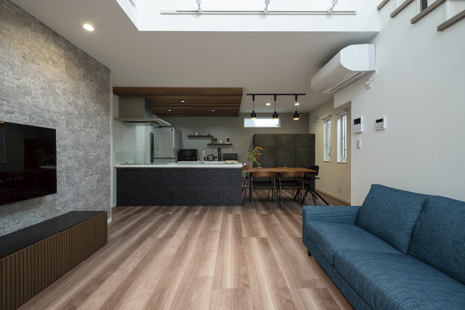黒と茶、グレーを基調にまとめたスタイリッシュな空間を実現。「壁掛けテレビの下地位置や、キッチン背面の飾り棚の配置を細かく提案してくれたおかげで、すっきりとした空間になりました」とTさん。深みのあるブルーのソファが程よいアクセントとなり、上質さと落ち着きが共存する心地よい空間に仕上がっている