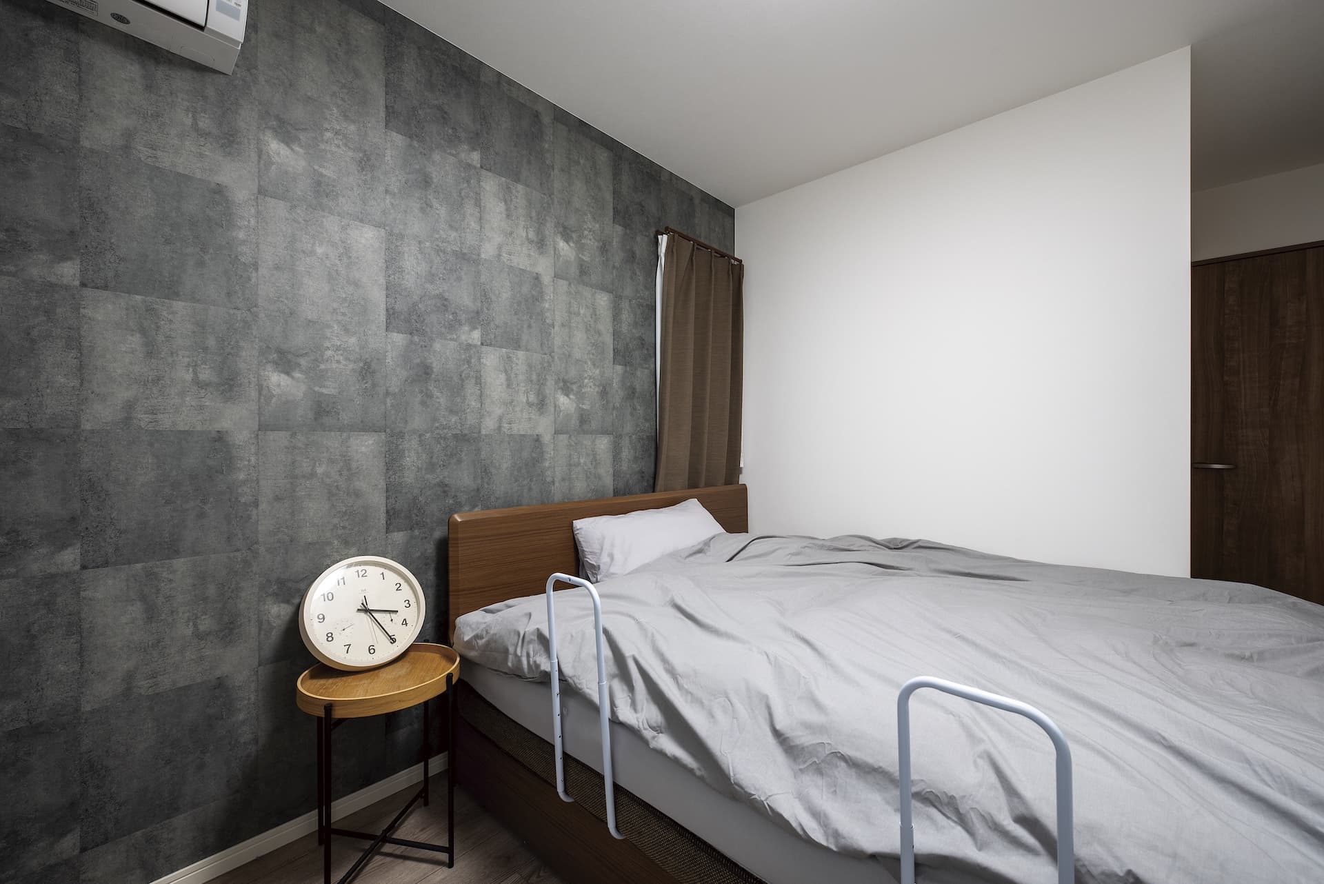 シックなクロスでコーディネートした2階の主寝室。標準仕様で断熱等性能等級6以上の性能を持つ断熱性能に優れた同社の家は、朝まで温度変化が少なく気持ちの良い睡眠が楽しめる。奥は大容量のウォークインクローゼット