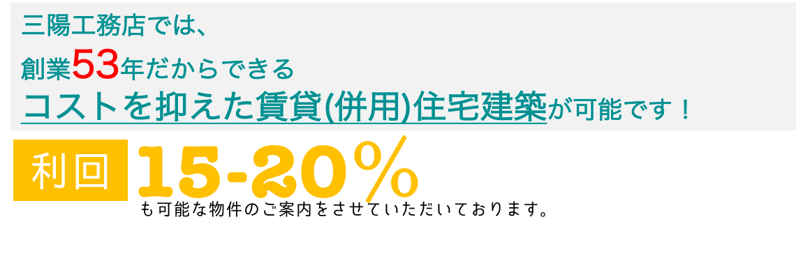 駅前や大きな県道、国道沿いの防火指定エリアでも三陽工務店の木造賃貸併用住宅は防火建築物で建築可能なので、コンクリートを使用せずに建築コストを低くすることが出来ます。もちろんRCと木造の混構造もリーズナブルに提供することが可能です。他社で出された見積もりに納得できない場合も、是非弊社へご相談下さい。