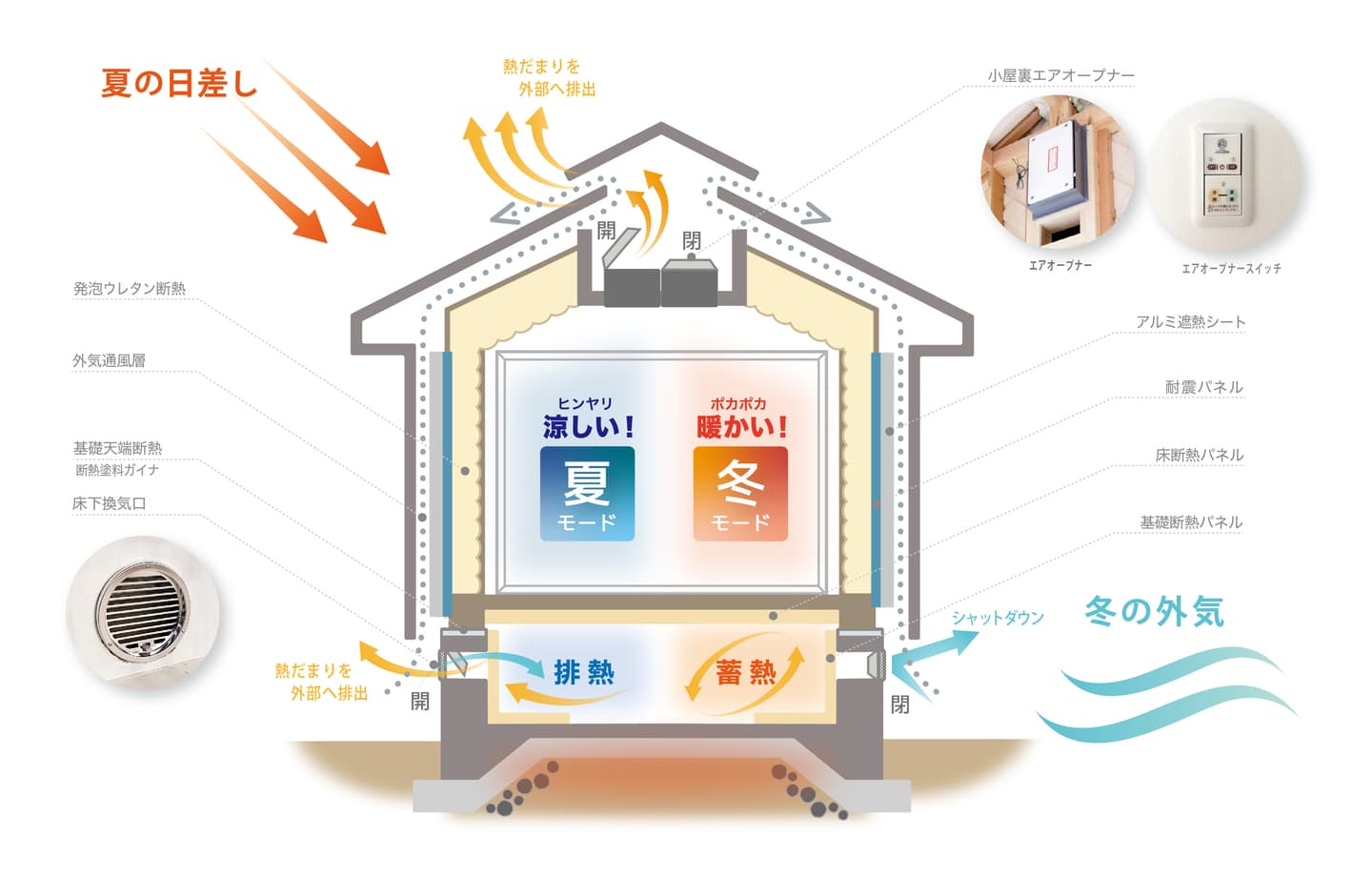 三陽工務店の家づくりは、サーモセンサー付きの床下換気口が自然に閉じることにより地熱を利用して床下を暖かい状態に保ちます。